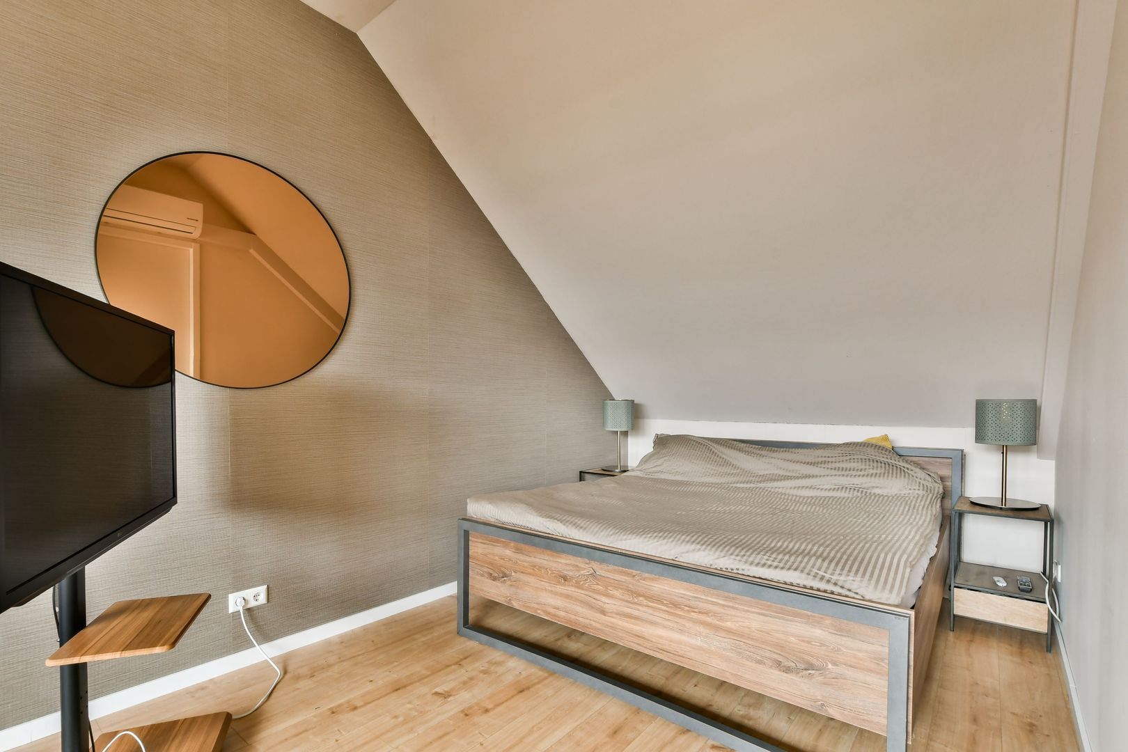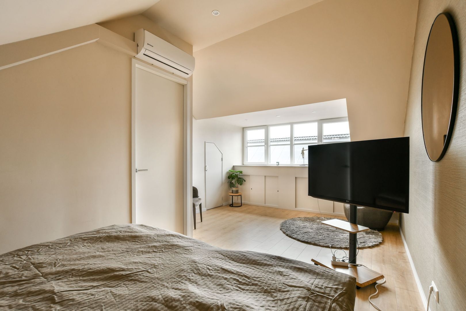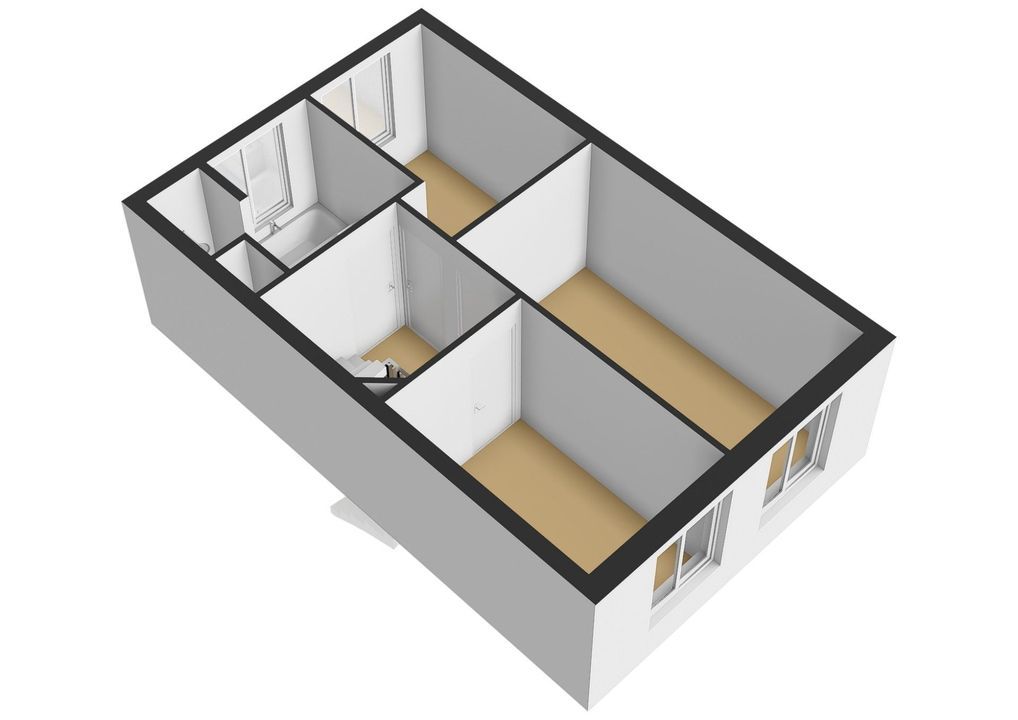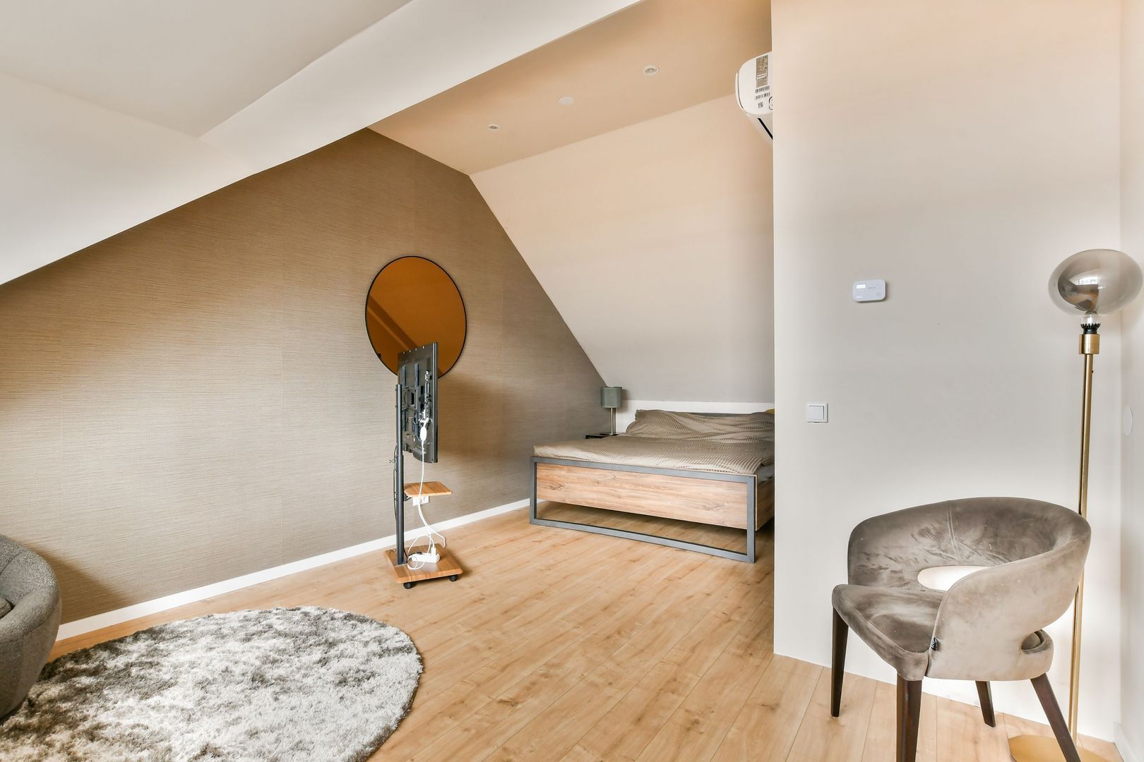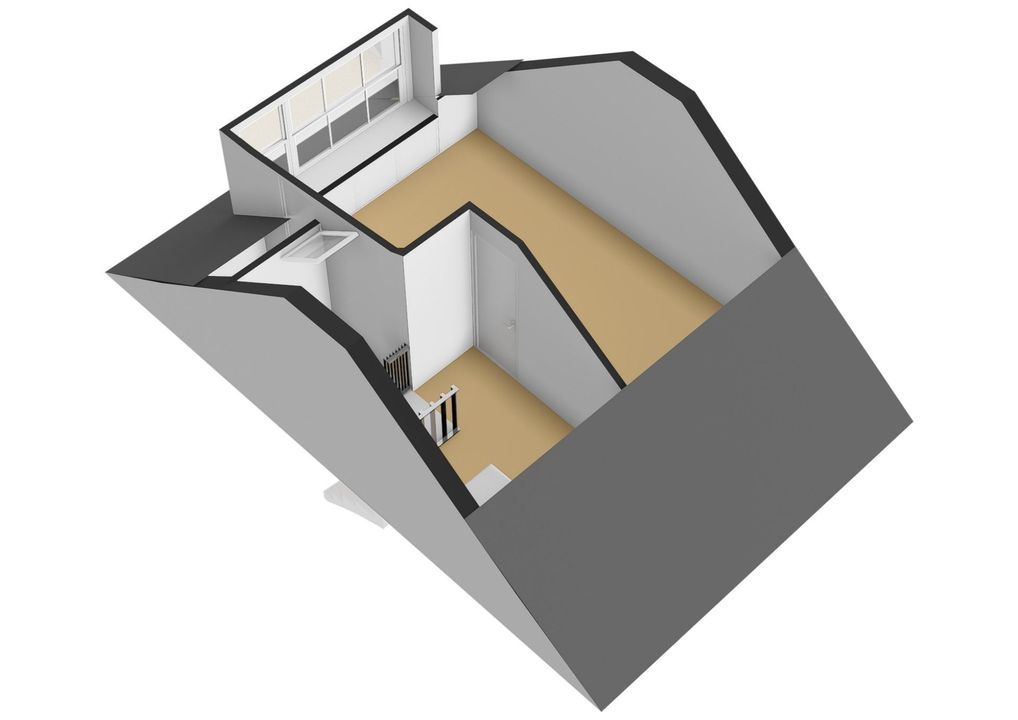 Ingedeelde zolder met zolderkamer met ca 22 m2 vloeroppervlakte, airco die kan koelen en verwarmen, laminaatvloer, bergruimte in de schuine dakvlakken en dakkapel met kunststof kozijnen voorzien van elektrisch rolluik. Overloopruimte met dakraam en aansluiting voor een wasmachine en droger.