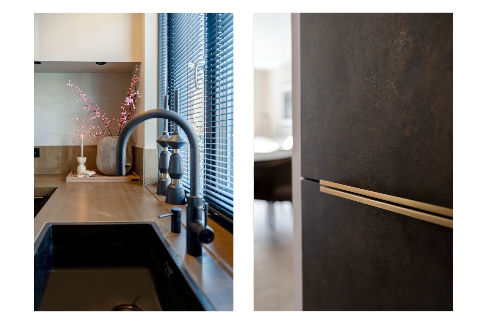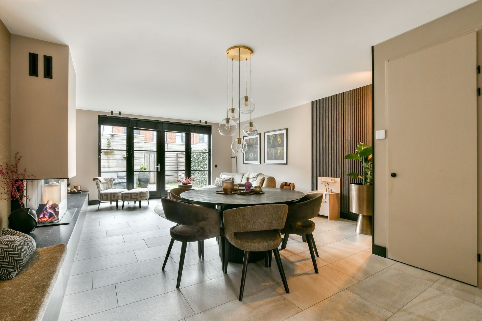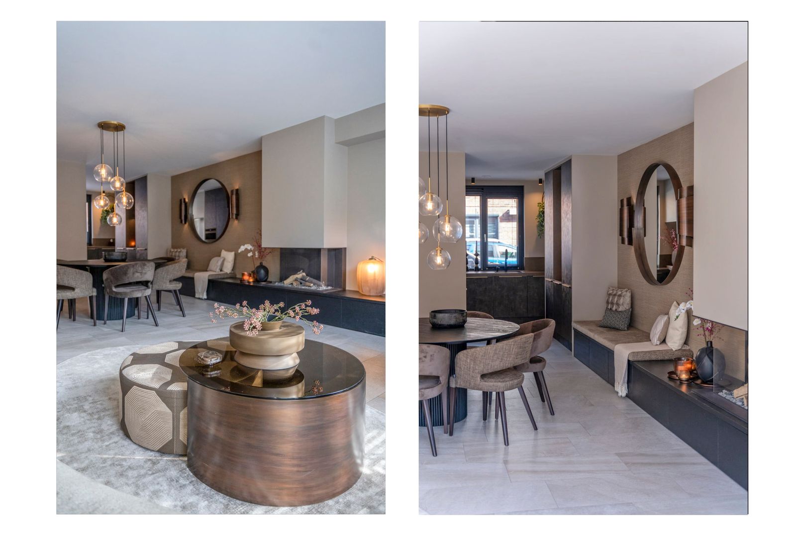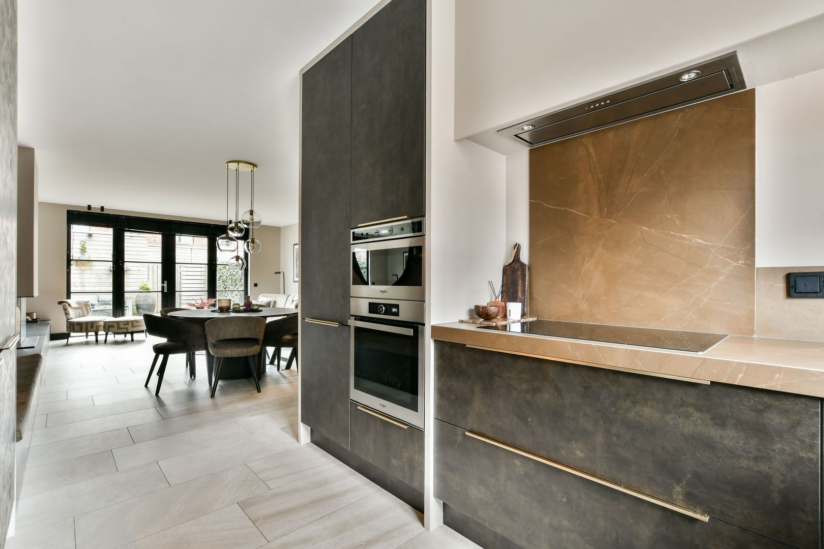 Entree, ruime hal met op maat gemaakte garderobekast, mooi hangend toilet afgewerkt met stijlvolle tegel en fonteintje, meterkast, trapopgang en toegang tot de woonkamer via een mooie glasdeur. De woonkamer van ca. 47 m2 heeft een uitbouw en veel lichtinval middels de grote openslaande deuren. De woonkamer is voorzien van een fraaie grote zandkleurige vloertegel met vloerverwarming, de wanden zijn afgewerkt met stucwerk en deels panelen, ook het plafond is glad gestuukt. Er is een sfeervolle gas openhaard met op maat gemaakte kasten en ingebouwde verlichting. Een grote vaste bergkast onder de trap. De open keuken aan de voorzijde heeft een keukenblok in hoekopstelling alsmede een blok met hoge kasten, een koffienis en een extra koelkast en vriezer. Er is gekozen voor een koperkleurig front met subtiele greep en keramiek aanrechtblad. Veel kastruimte en de navolgende inbouwapparatuur; vaatwasser, 2 grote koelkasten, 2x 3-vaks vriezer, inductie kookplaat, afzuigkap met afvoer naar buiten, heteluchtoven, magnetron en een Quooker kokend waterkraan.