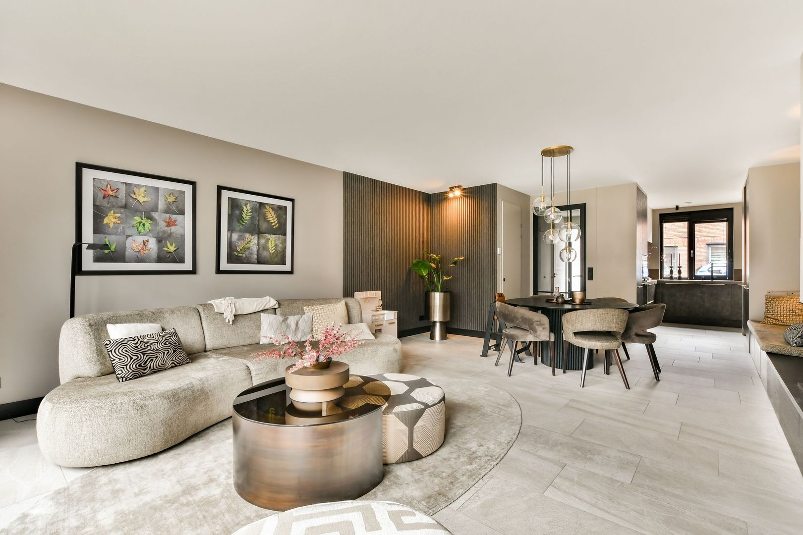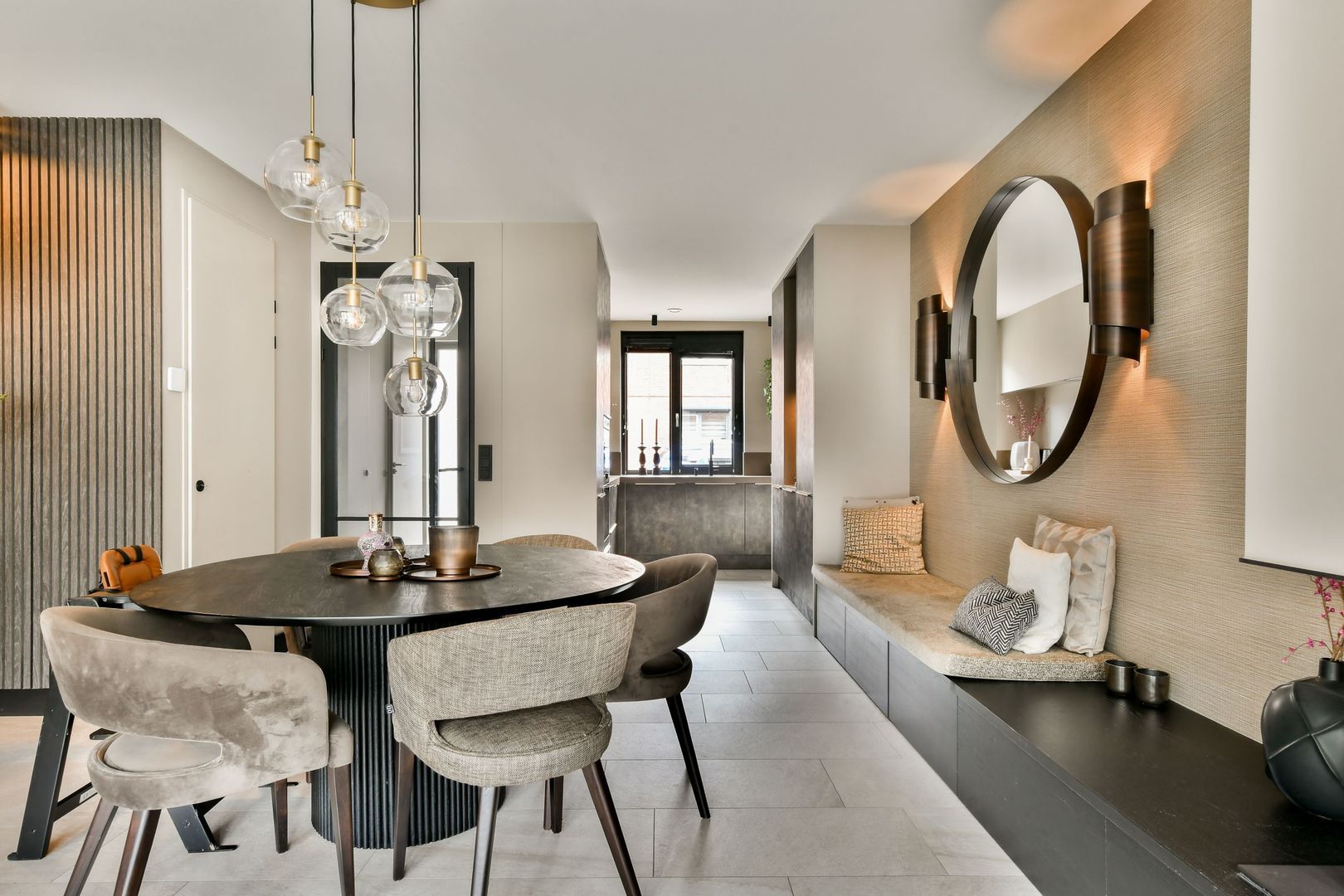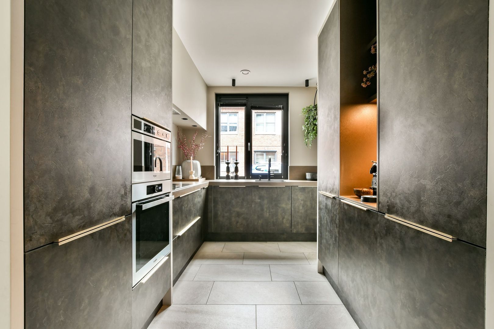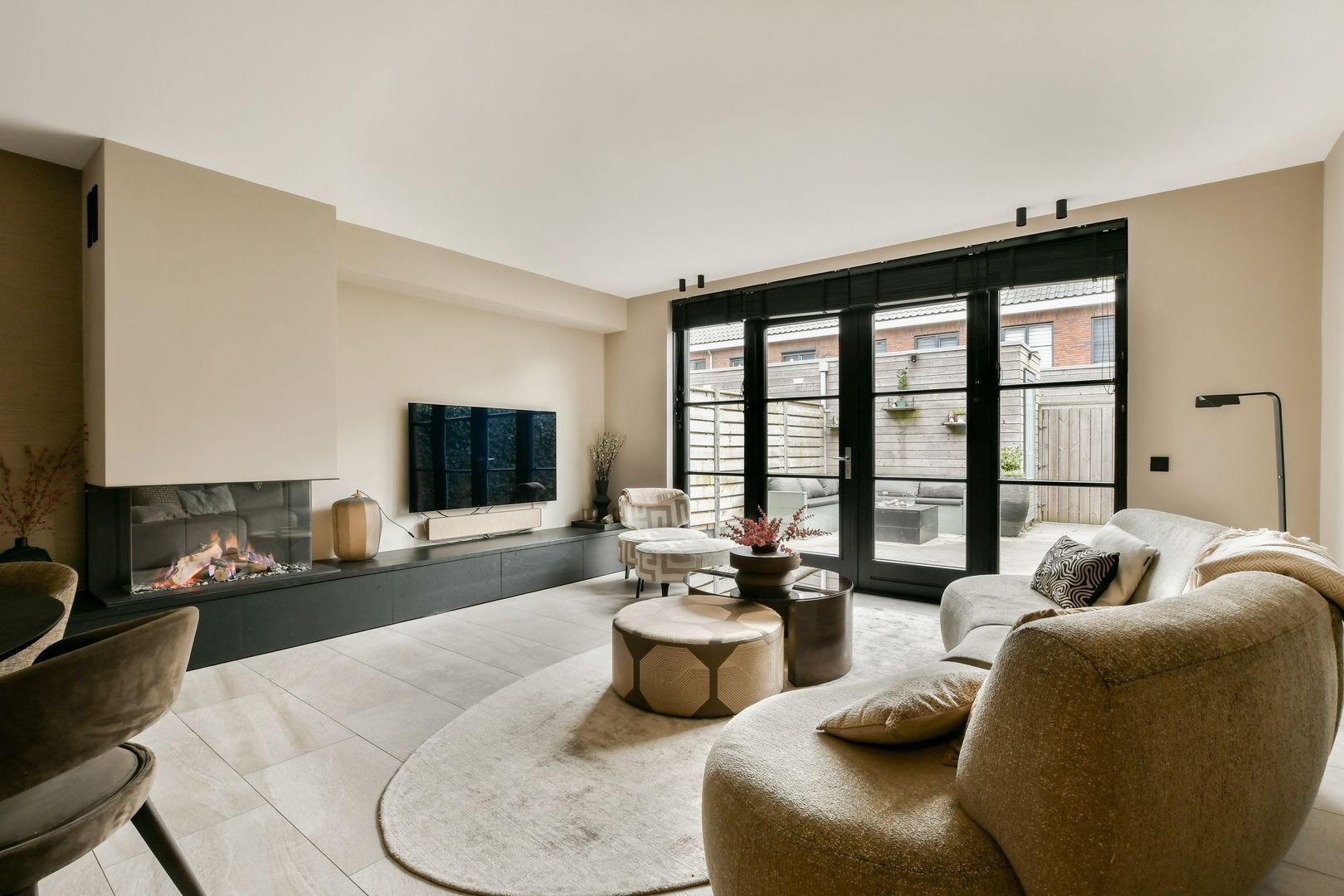 Entree, ruime hal met op maat gemaakte garderobekast, mooi hangend toilet afgewerkt met stijlvolle tegel en fonteintje, meterkast, trapopgang en toegang tot de woonkamer via een mooie glasdeur. De woonkamer van ca. 47 m2 heeft een uitbouw en veel lichtinval middels de grote openslaande deuren. De woonkamer is voorzien van een fraaie grote zandkleurige vloertegel met vloerverwarming, de wanden zijn afgewerkt met stucwerk en deels panelen, ook het plafond is glad gestuukt. Er is een sfeervolle gas openhaard met op maat gemaakte kasten en ingebouwde verlichting. Een grote vaste bergkast onder de trap. De open keuken aan de voorzijde heeft een keukenblok in hoekopstelling alsmede een blok met hoge kasten, een koffienis en een extra koelkast en vriezer. Er is gekozen voor een koperkleurig front met subtiele greep en keramiek aanrechtblad. Veel kastruimte en de navolgende inbouwapparatuur; vaatwasser, 2 grote koelkasten, 2x 3-vaks vriezer, inductie kookplaat, afzuigkap met afvoer naar buiten, heteluchtoven, magnetron en een Quooker kokend waterkraan.