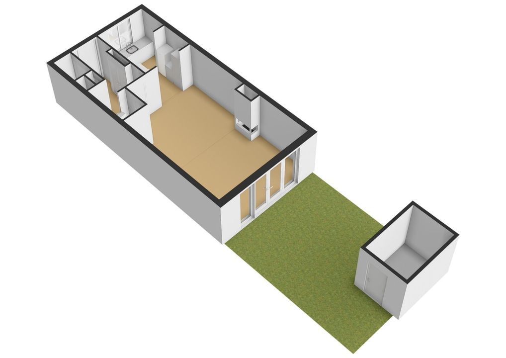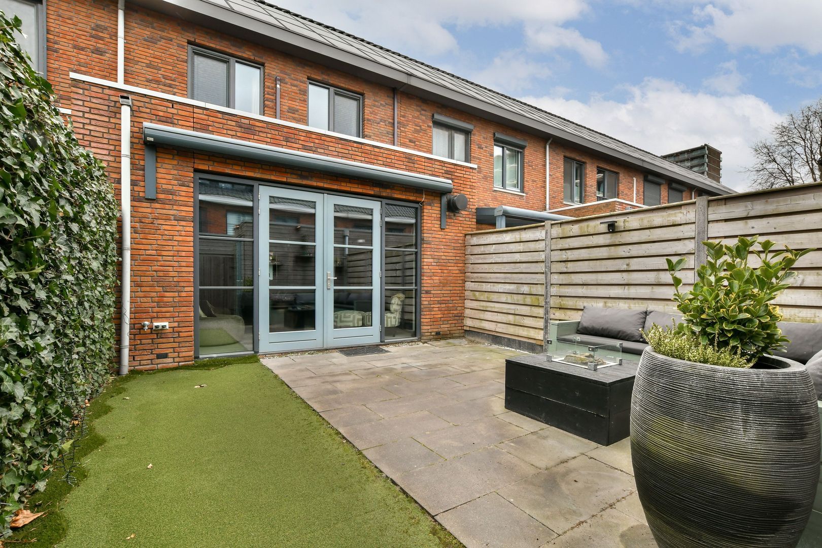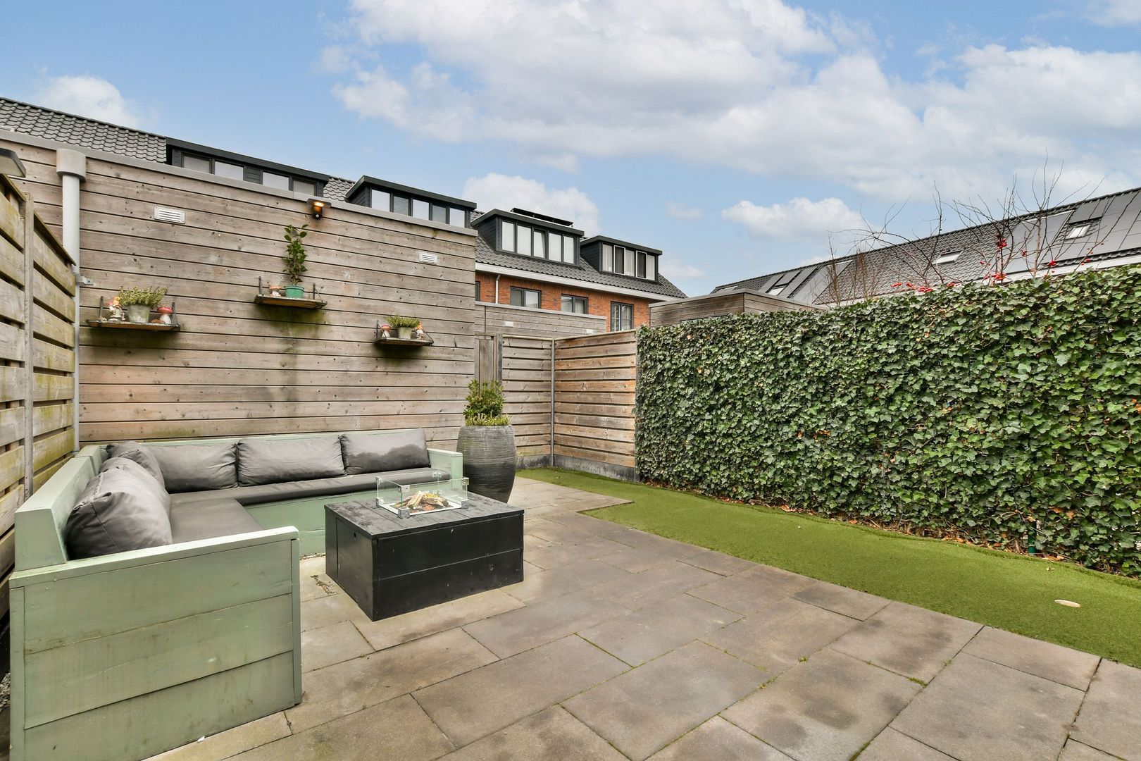 Via de openslaande deuren bereikt u de achtertuin welke op het westen gelegen is. De tuin heeft een mooie mix tussen sier betontegels, groen en beplanting. De tuinafscheiding is voorzien van een fraaie houten schutting. De tuin is ruim 7m diep en 5,5 m breed. Achterin de tuin staat een ruime houten berging van ca. 6 m2 op betonplaat, welke is voorzien van elektra. Daarnaast is er in de tuin ook een buitenkraan, twee stopcontacten en elektrisch zonnescherm.