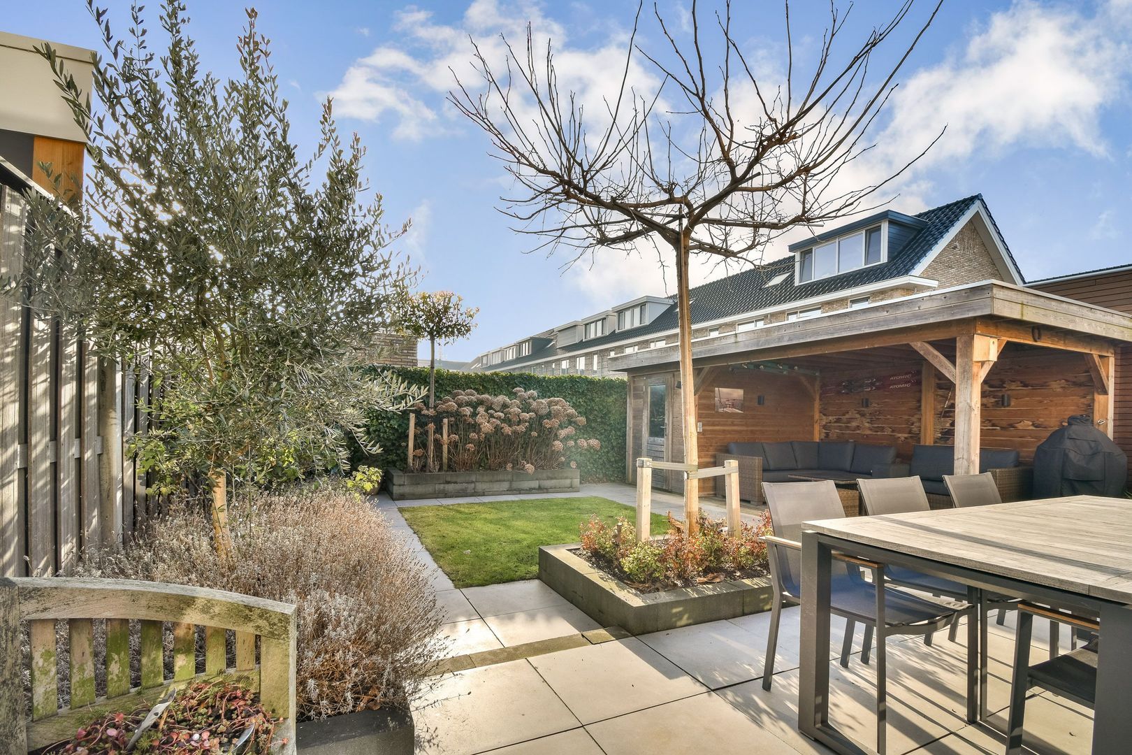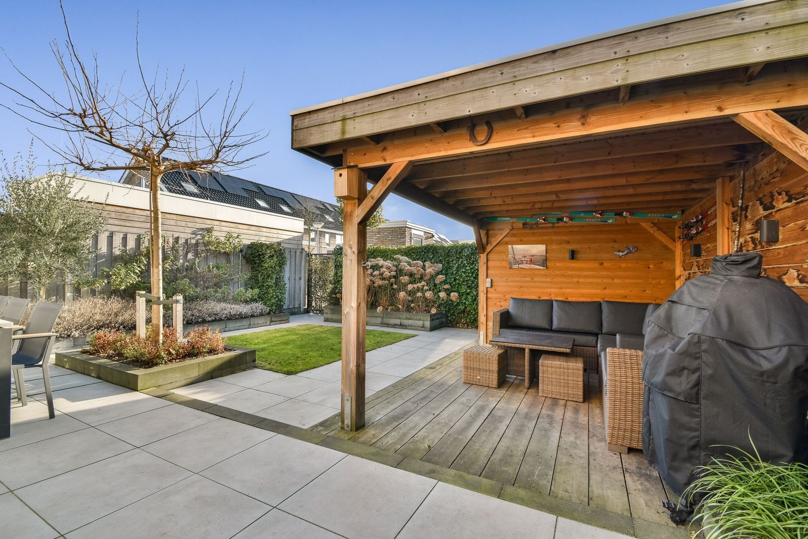 Fraai aangelegde, circa 10 meter diepe achtertuin, gelegen op het zuiden, met grote strakke tegels, gazon en een breed terras. Elektrisch zonnescherm, gezellige terrasoverkapping van ca. 12 m² met aansluitende berging van ca. 4 m², voorzien van elektra. Achterom aanwezig.