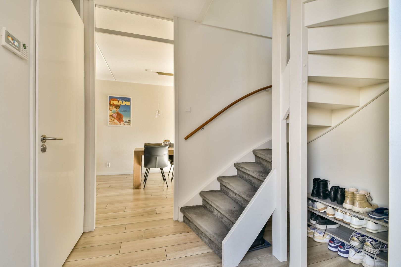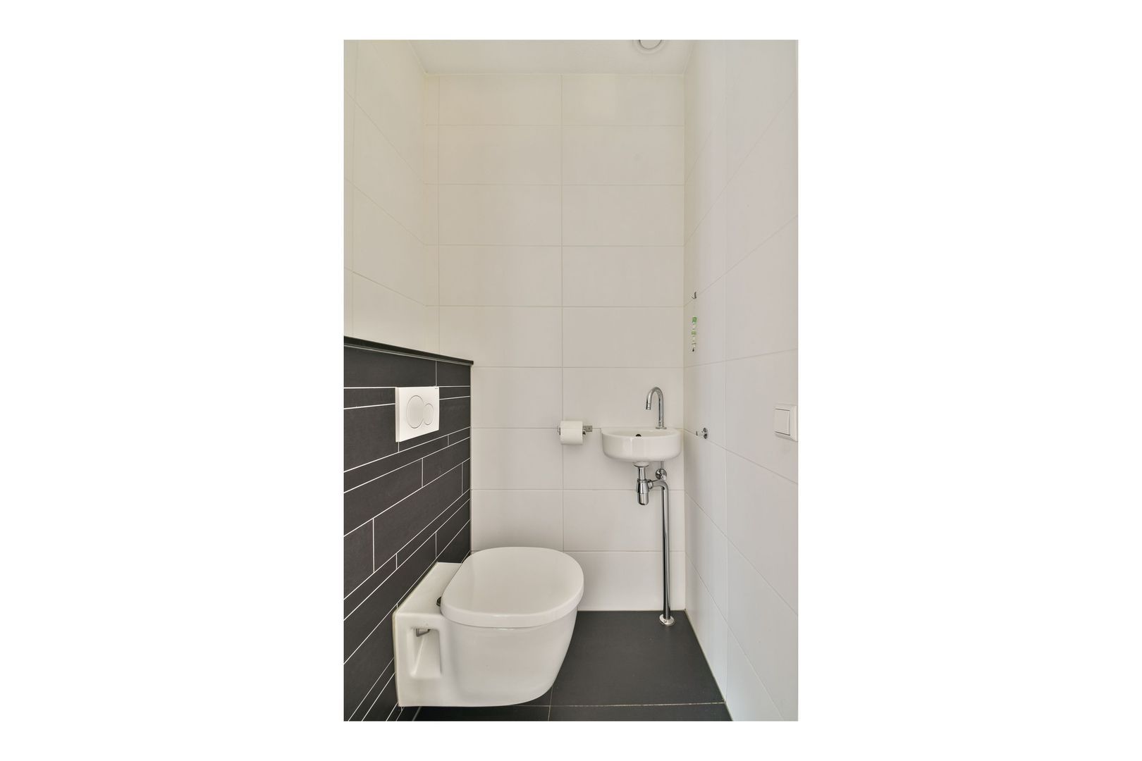 Entree, hal met bergruimte onder de trap, meterkast en toiletruimte met zwevend toilet en fonteintje, uitgevoerd met witte en antracietkleurige betegeling.