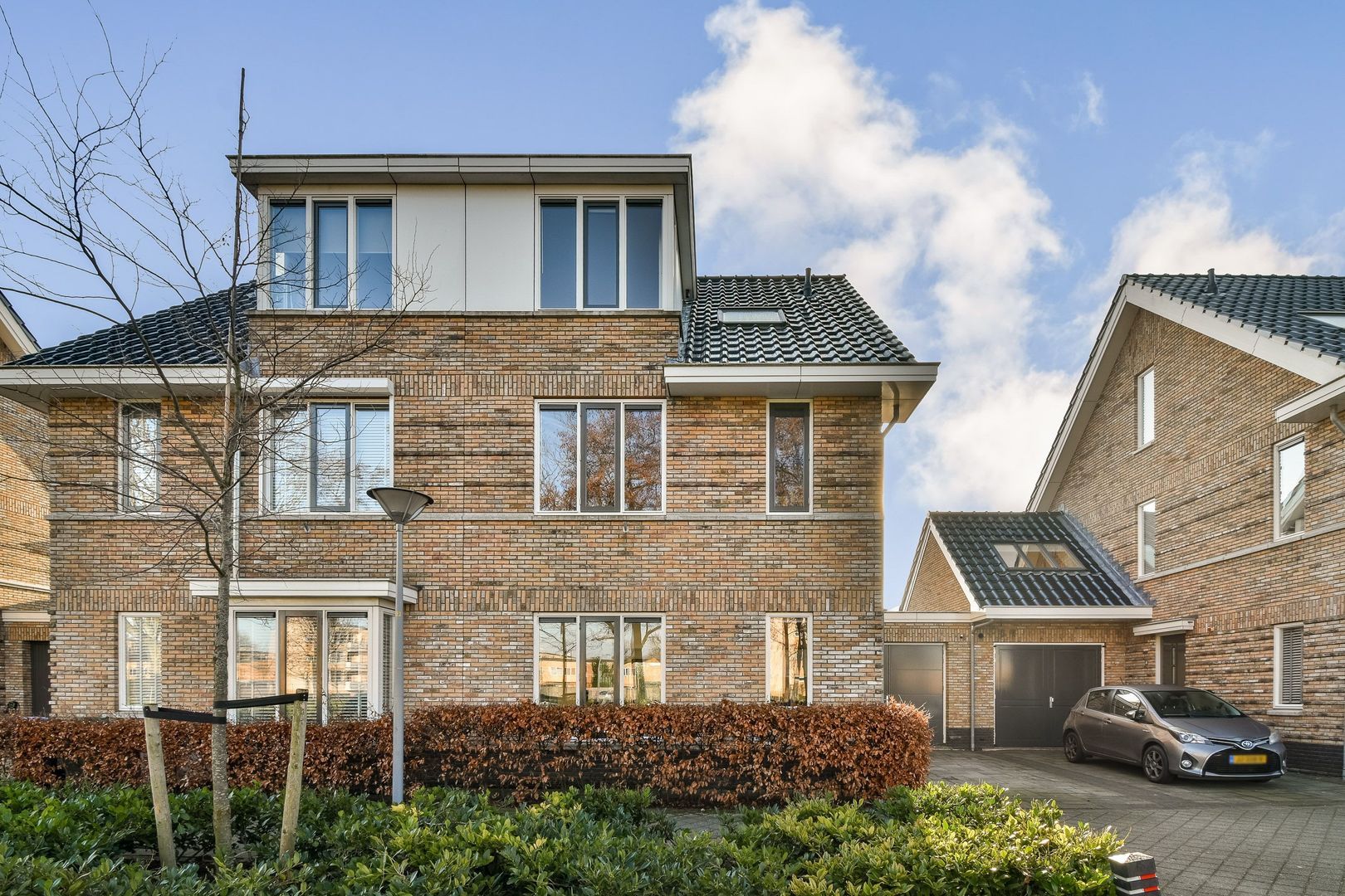 De voortuin is leuk aangelegd met groen, biedt vrij uitzicht en beschikt over een oprit met eigen parkeerplaats voor de garage.