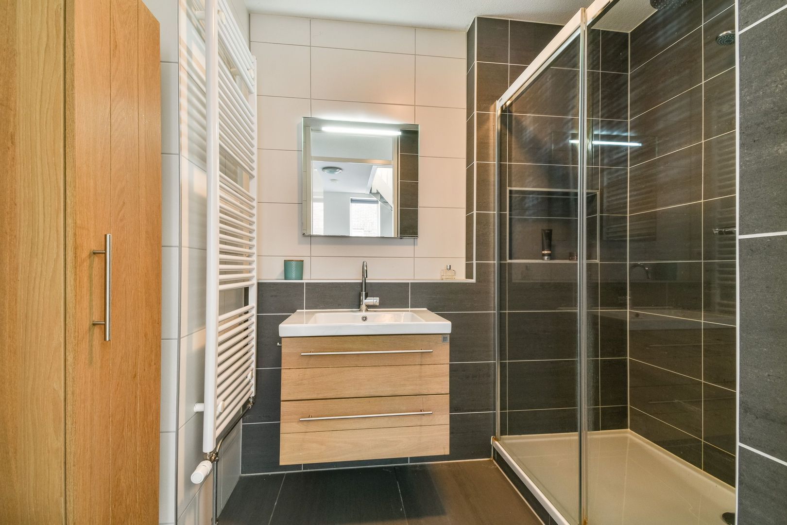 Luxe badkamer met elektrische vloerverwarming, uitgevoerd in witte en antracietkleurige betegeling en voorzien van een separate douche met watergoot, handdoekenradiator en een breed wastafelmeubel met spiegel.