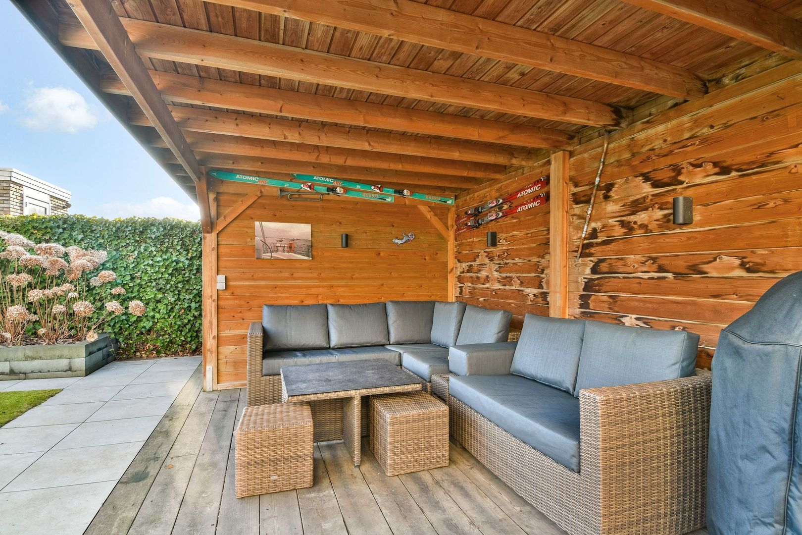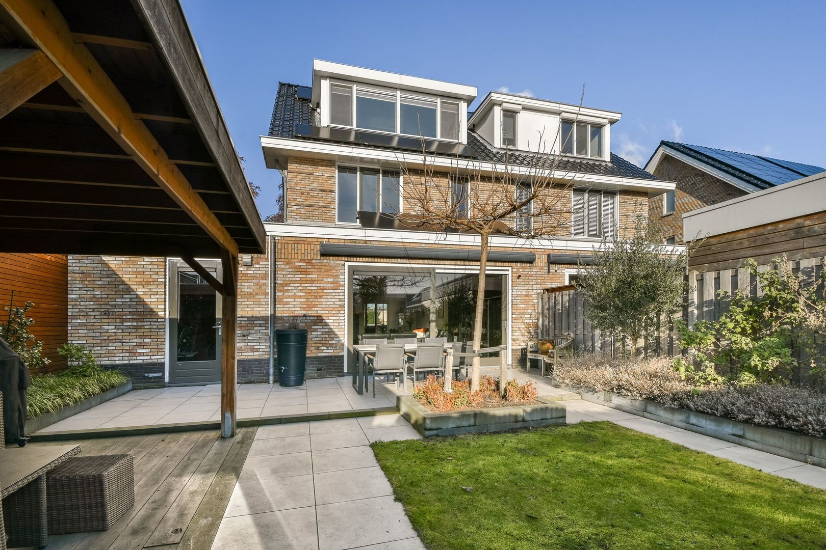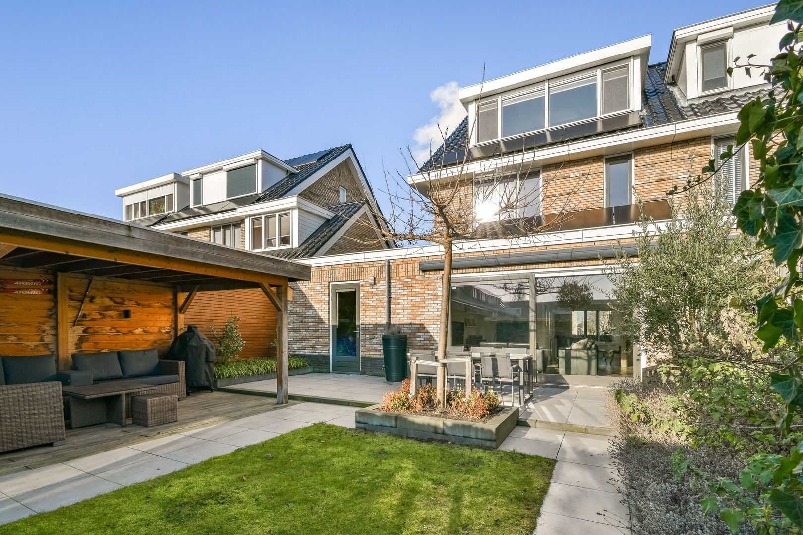 Fraai aangelegde, circa 10 meter diepe achtertuin, gelegen op het zuiden, met grote strakke tegels, gazon en een breed terras. Elektrisch zonnescherm, gezellige terrasoverkapping van ca. 12 m² met aansluitende berging van ca. 4 m², voorzien van elektra. Achterom aanwezig.