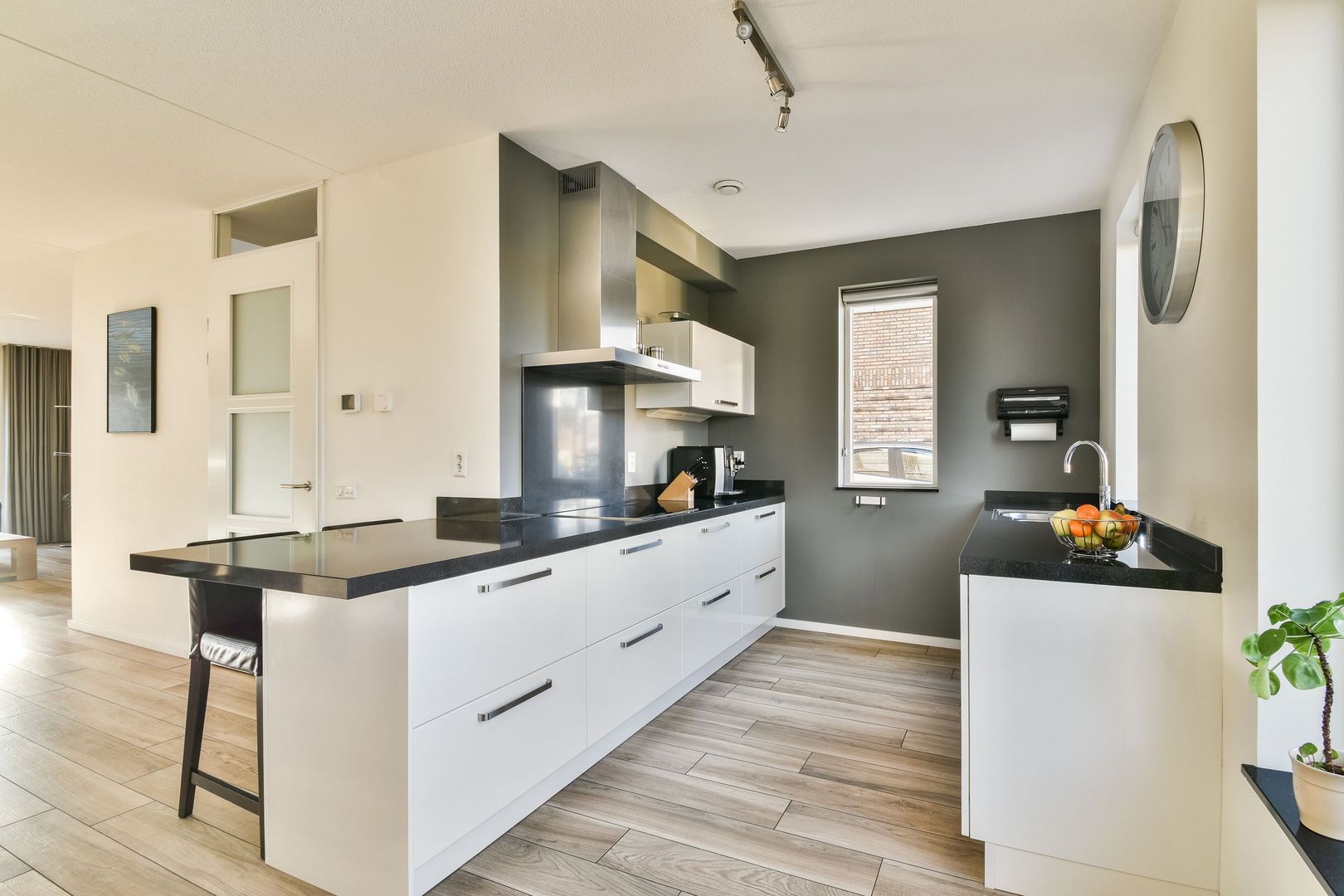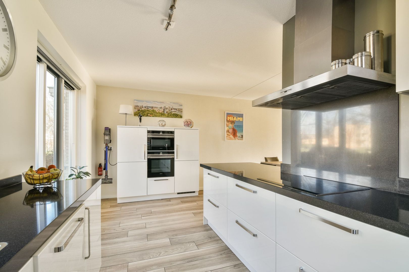 De luxe open keuken van Bruynzeel is uitgevoerd in hoogglans wit met een zwart natuurstenen aanrechtblad, opgesteld in drie delen en voorzien van de volgende inbouwapparatuur: inductiekookplaat, RVS afzuigkap, Quooker-kraan, heteluchtoven, combi-oven/magnetron, vaatwasser, koelkast en een vriezer met zes laden.