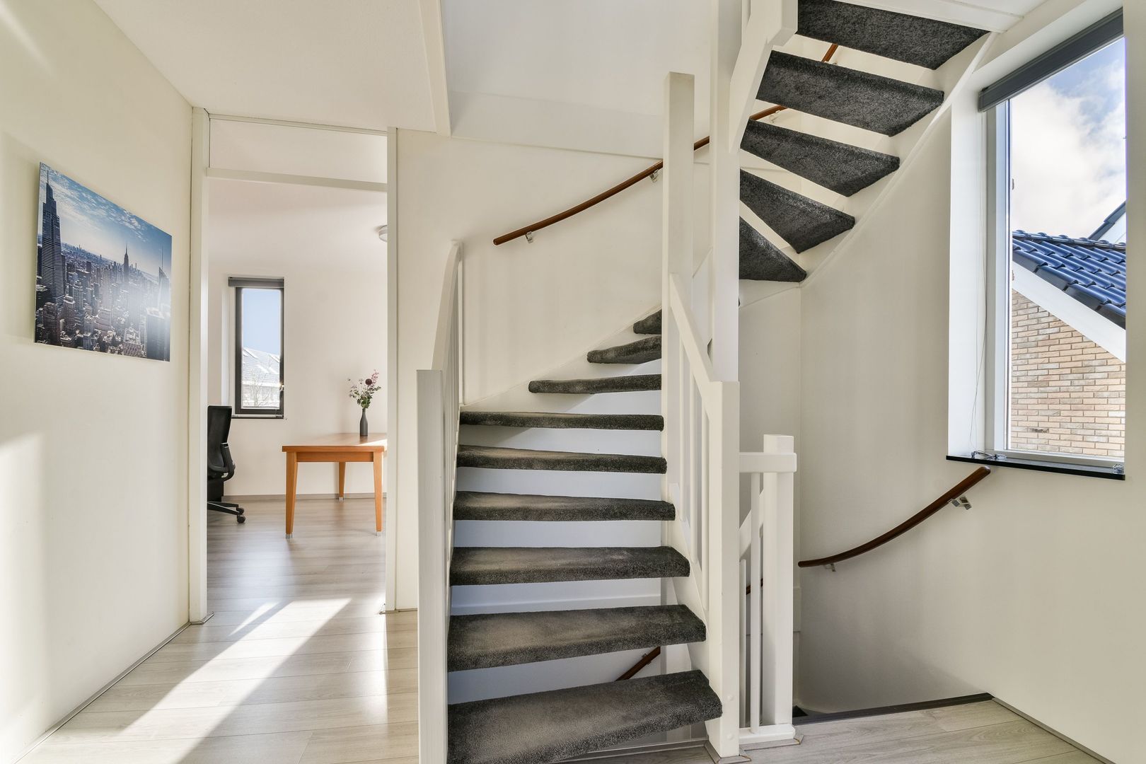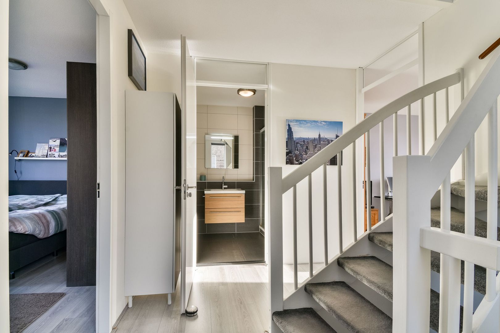 Ruime overloop met daglicht via een hoekraam, apart tweede zwevend toilet met fonteintje.