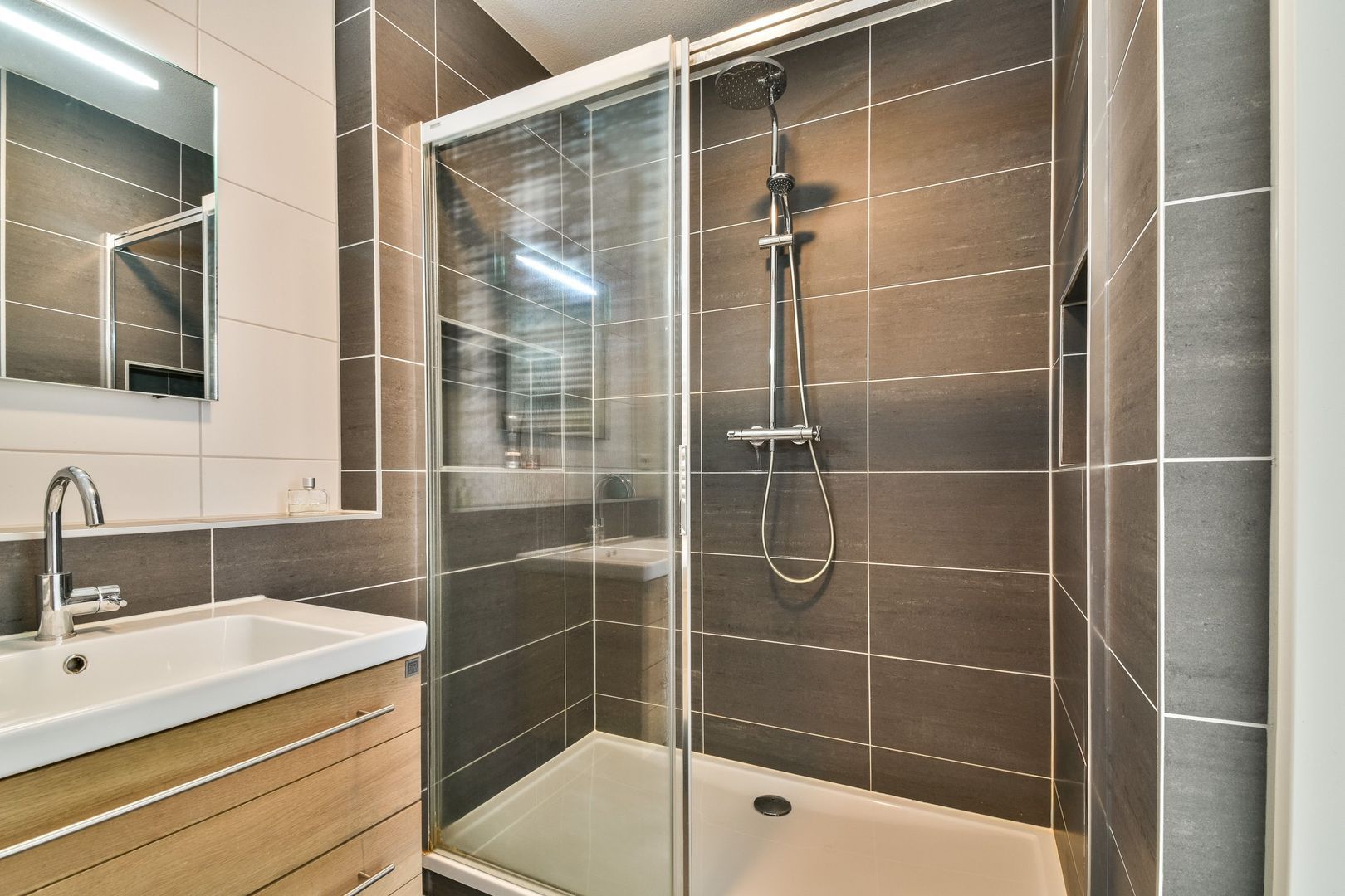 Luxe badkamer met elektrische vloerverwarming, uitgevoerd in witte en antracietkleurige betegeling en voorzien van een separate douche met watergoot, handdoekenradiator en een breed wastafelmeubel met spiegel.