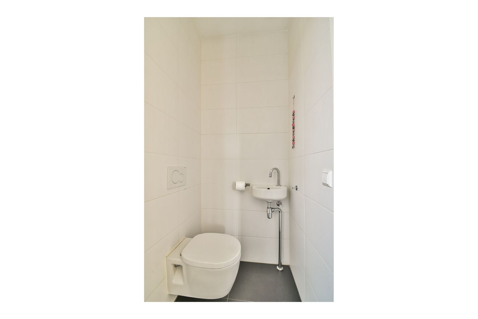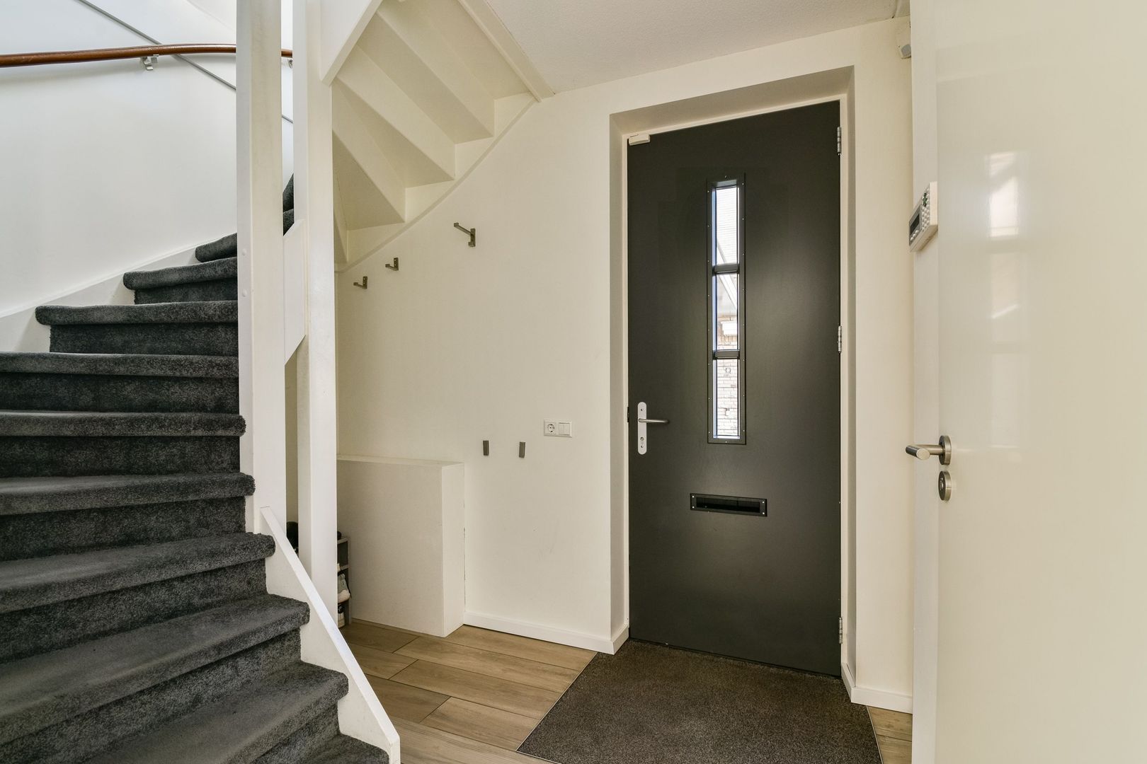 Entree, hal met bergruimte onder de trap, meterkast en toiletruimte met zwevend toilet en fonteintje, uitgevoerd met witte en antracietkleurige betegeling.