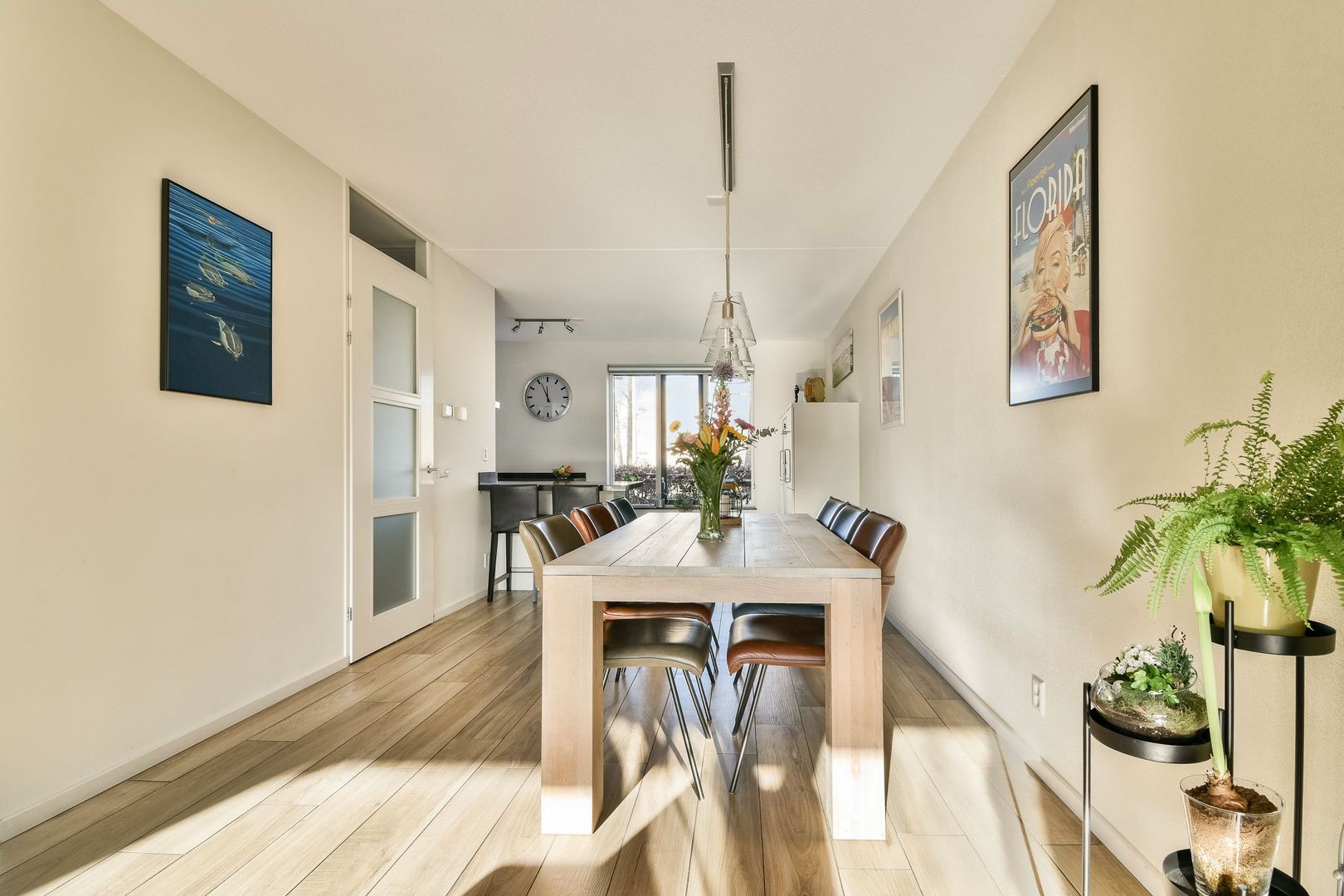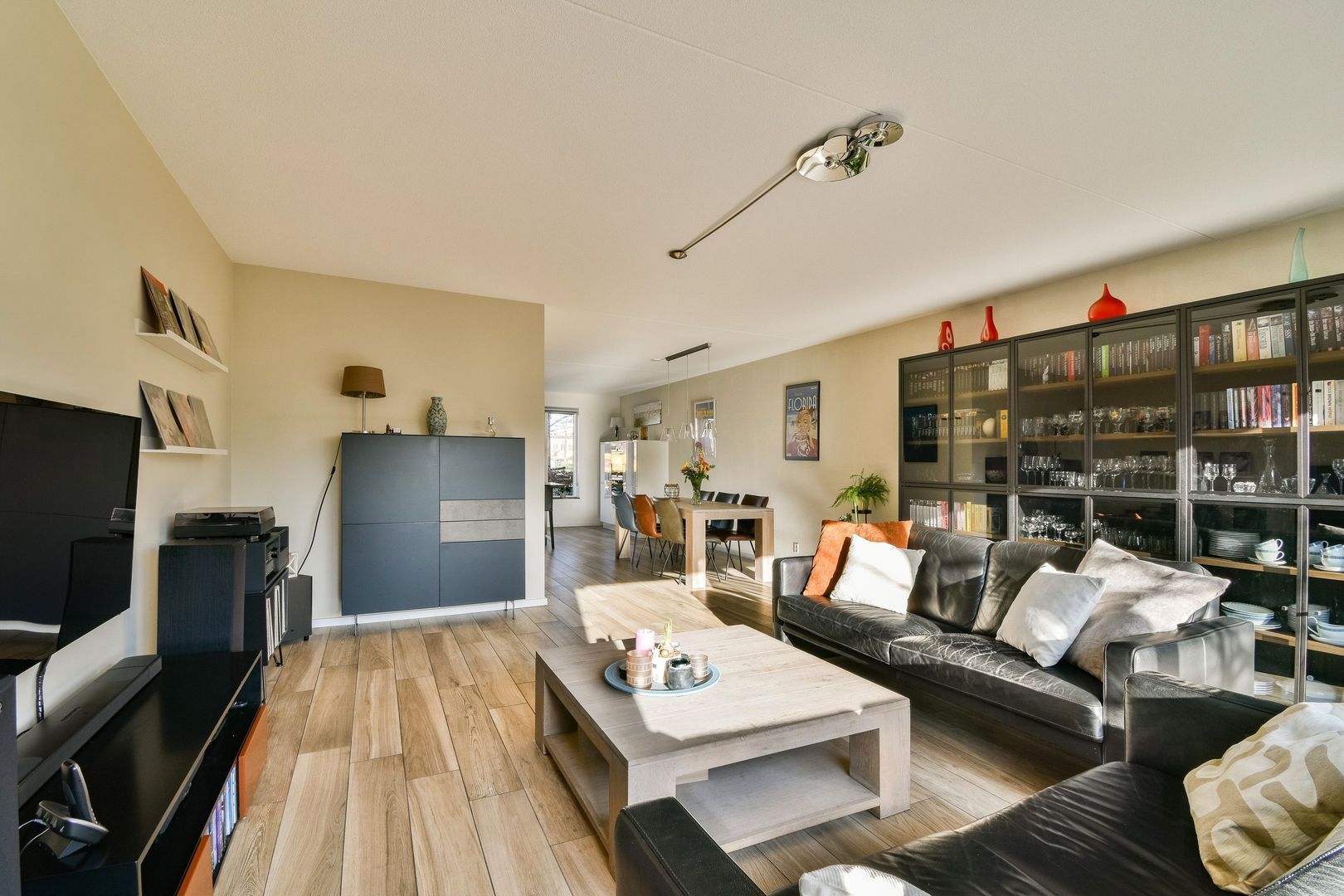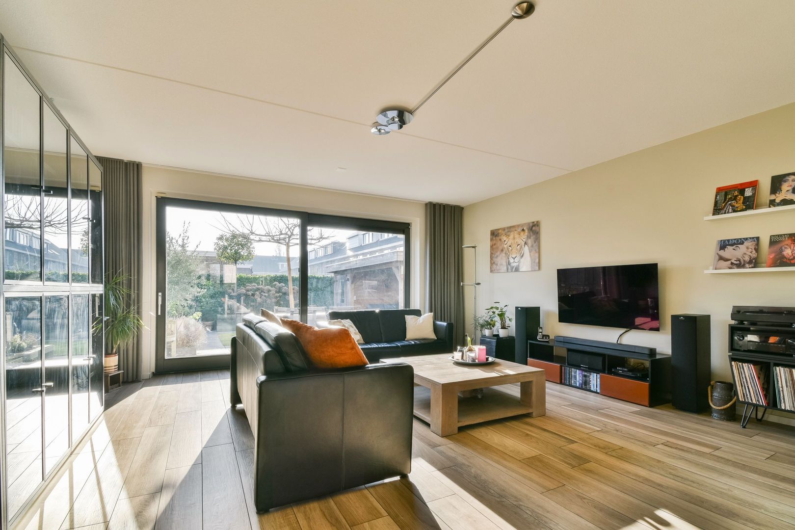Riante woonkamer met open keuken met een totaaloppervlak van ca. 58 m². Via de grote schuifpui is er toegang tot de tuin.