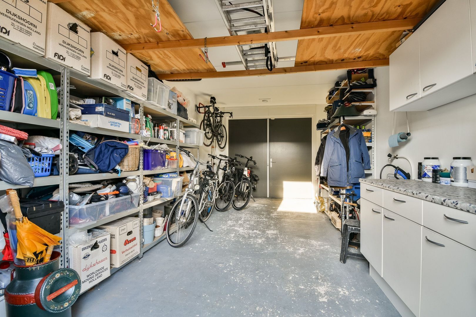 Royale garage van ca. 19,7 m² met een plafondhoogte van 260 cm, geïsoleerd en voorzien van water en elektriciteit, openslaande garagedeuren, stortbak en een deur naar de tuin.