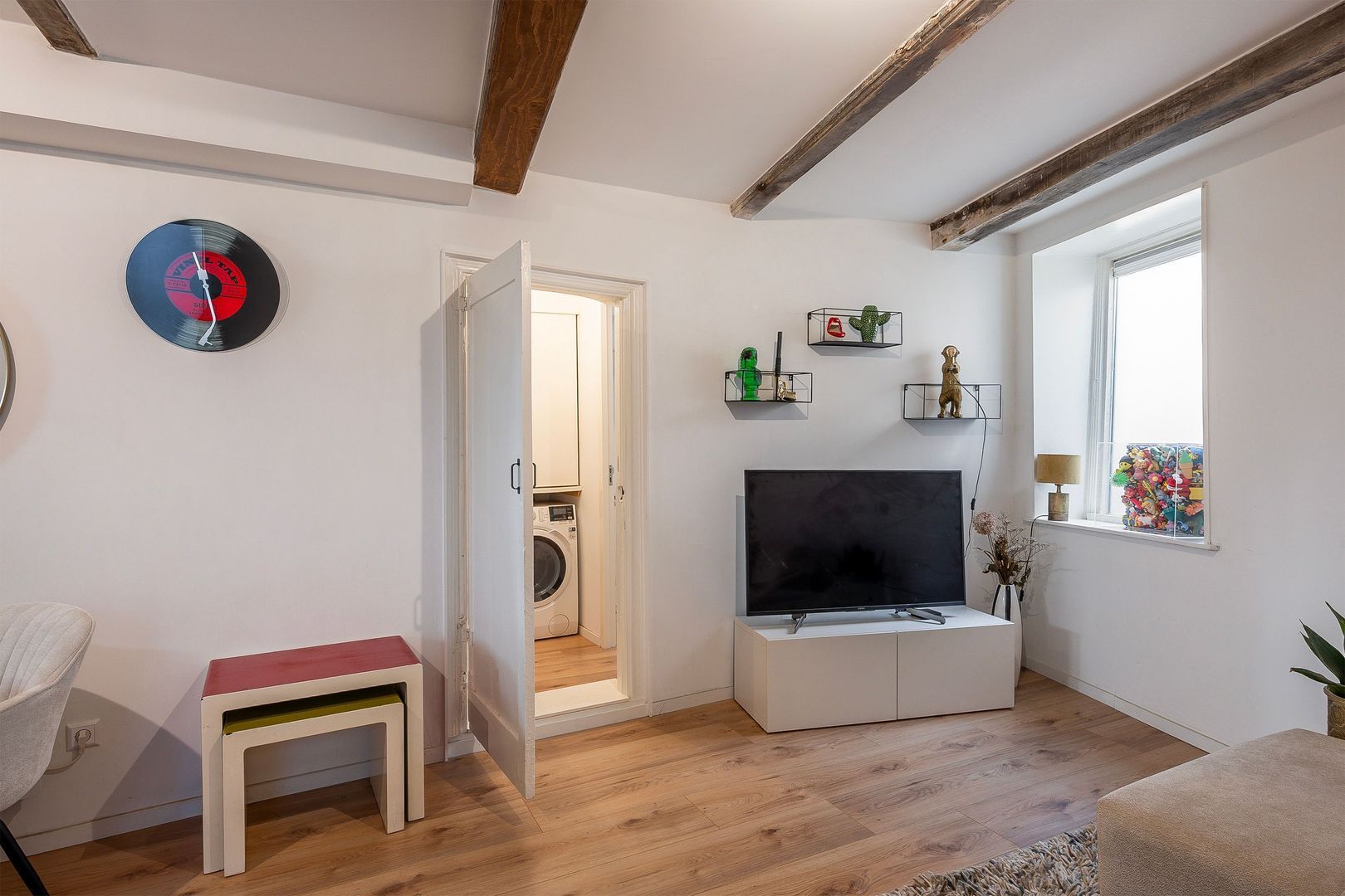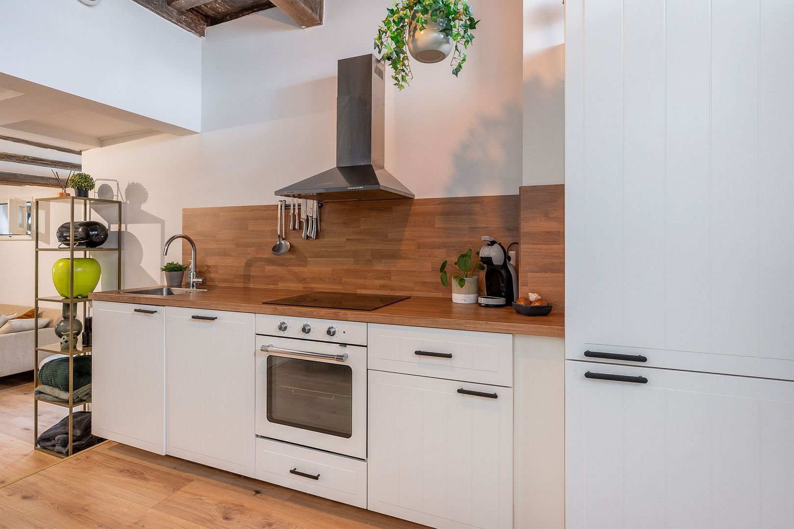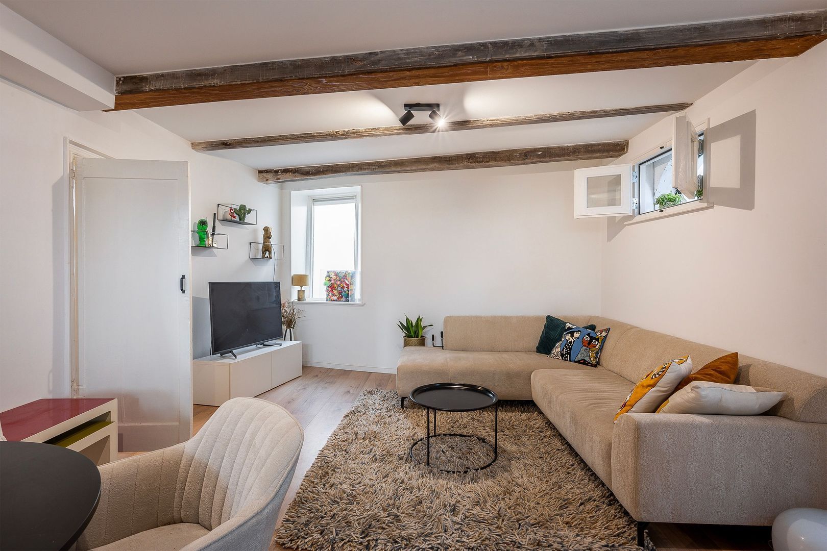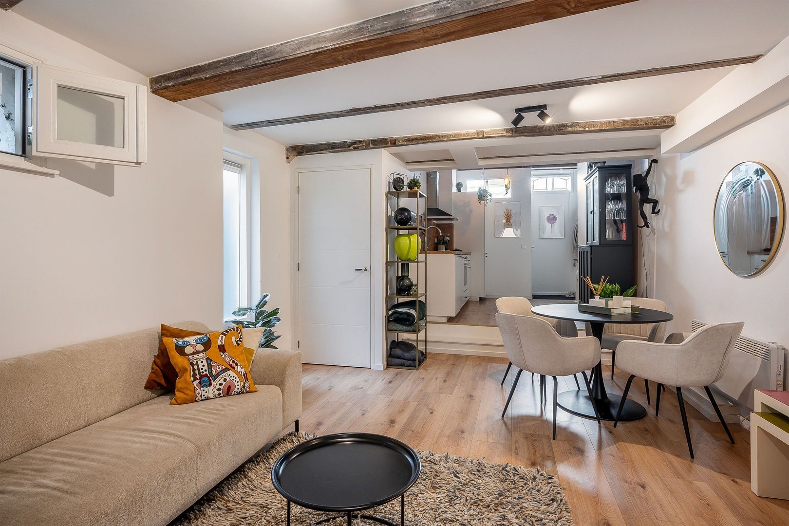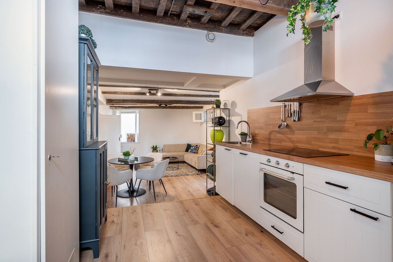 U betreedt de heerlijke open woonkamer van totaal ca. 34 m2, met moderne Ikea open keuken, die is voorzien van koel-/vriescombinatie, vaatwasser, oven, inductiekookplaat en afzuigkap. Door een klein niveauverschil is het zitgedeelte open, maar toch afgescheiden. In de woonkamer zijn de oude authentieke balken in het zicht, daarnaast zitten er mooie oude stalramen in, ook is er een handige trapkast. Mooie eiken print laminaatvloer en strak gestuukte wanden op de begane grond.