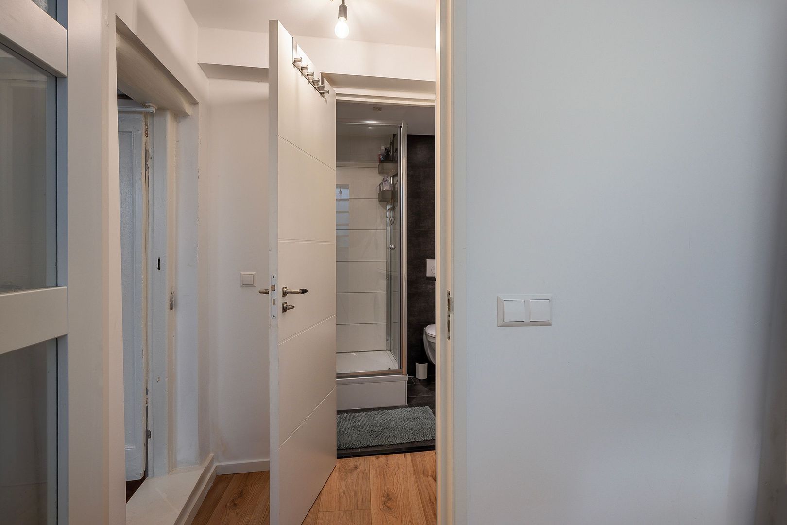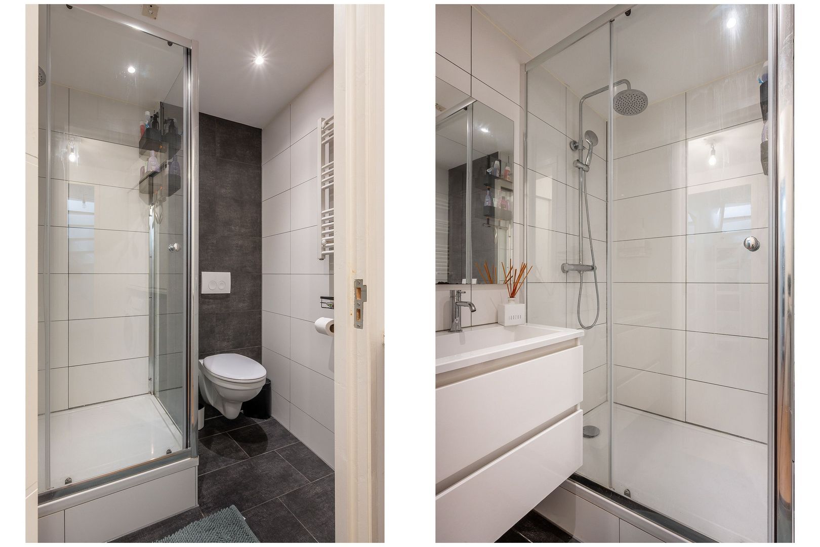 De badkamer is voorzien van grote douchecabine, zwevend toilet, breed wastafelmeubel, elektrische handdoekenradiator, antraciet vloertegel en wtte wandtegel, plafond met ingebouwde verlichting.