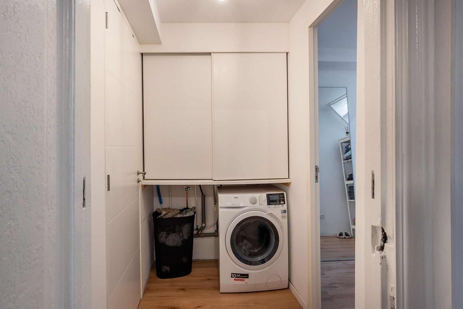 Via een deur komt u in de hal, deze heeft een waskast, elektrische boiler (100 liter) en mechanische ventilatie. Vanuit de hal is zowel de badkamer als de slaapkamer toegankelijk (de slaapkamer via een trap).
