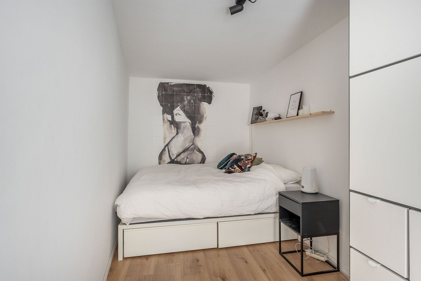 Slaapkamer op de 1e verdieping van ruim 10 m2 met laminaatvloer en raampartij.