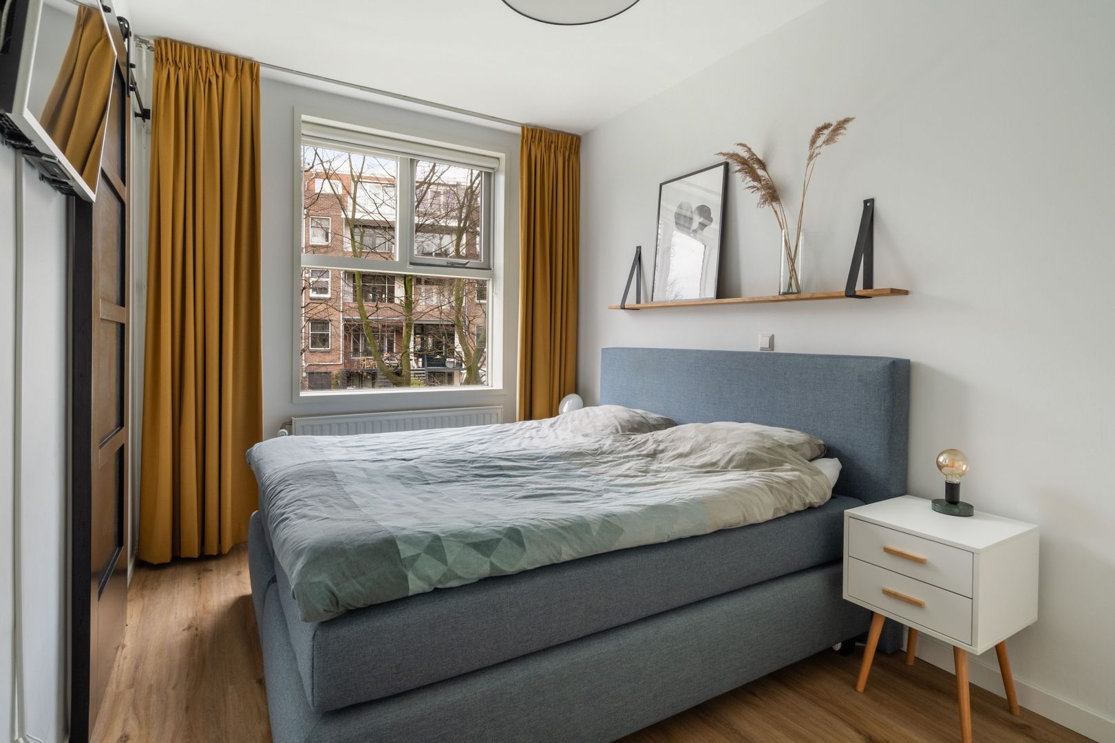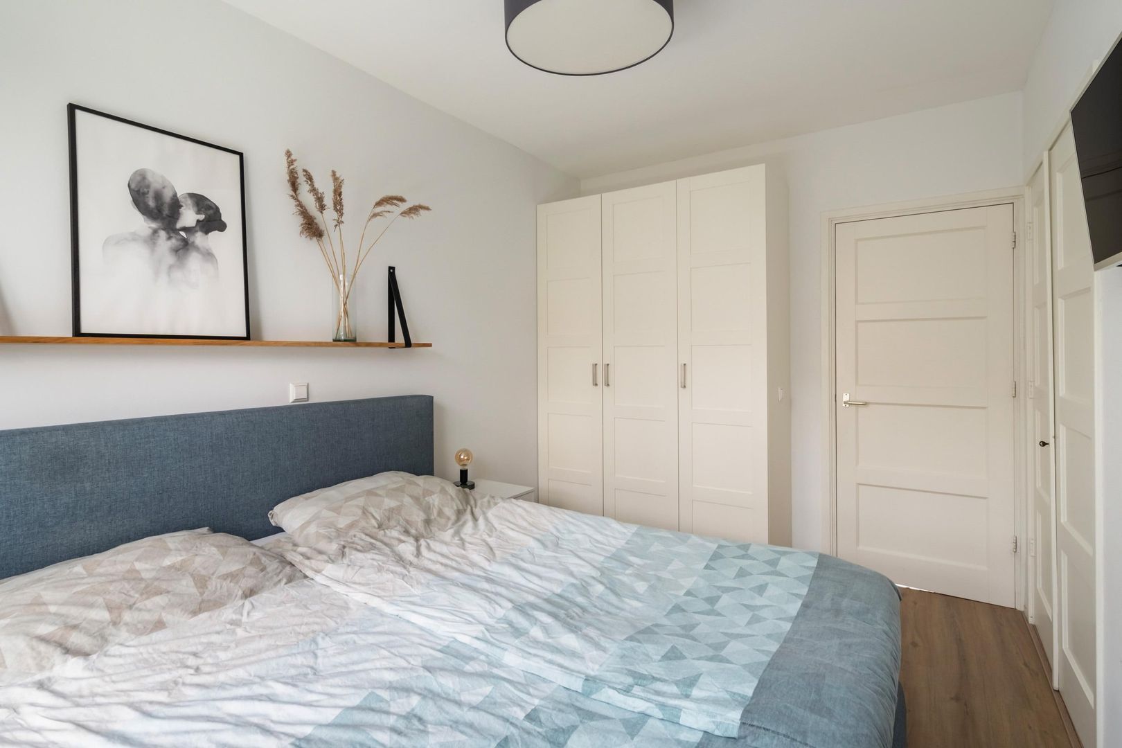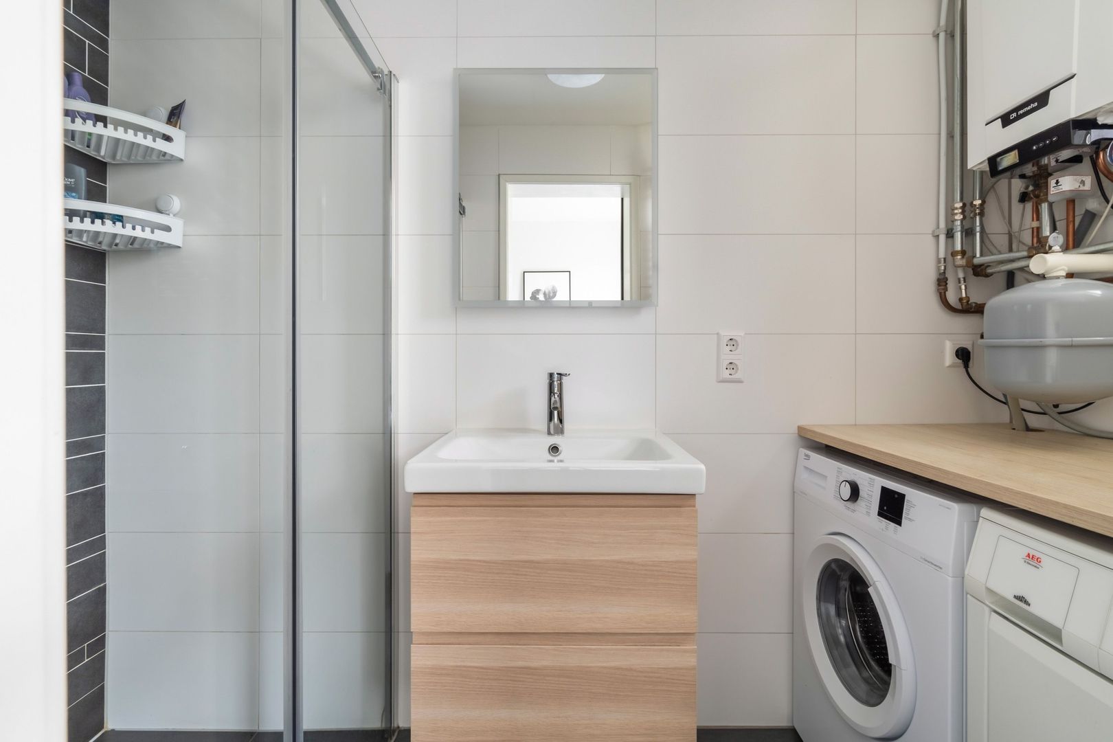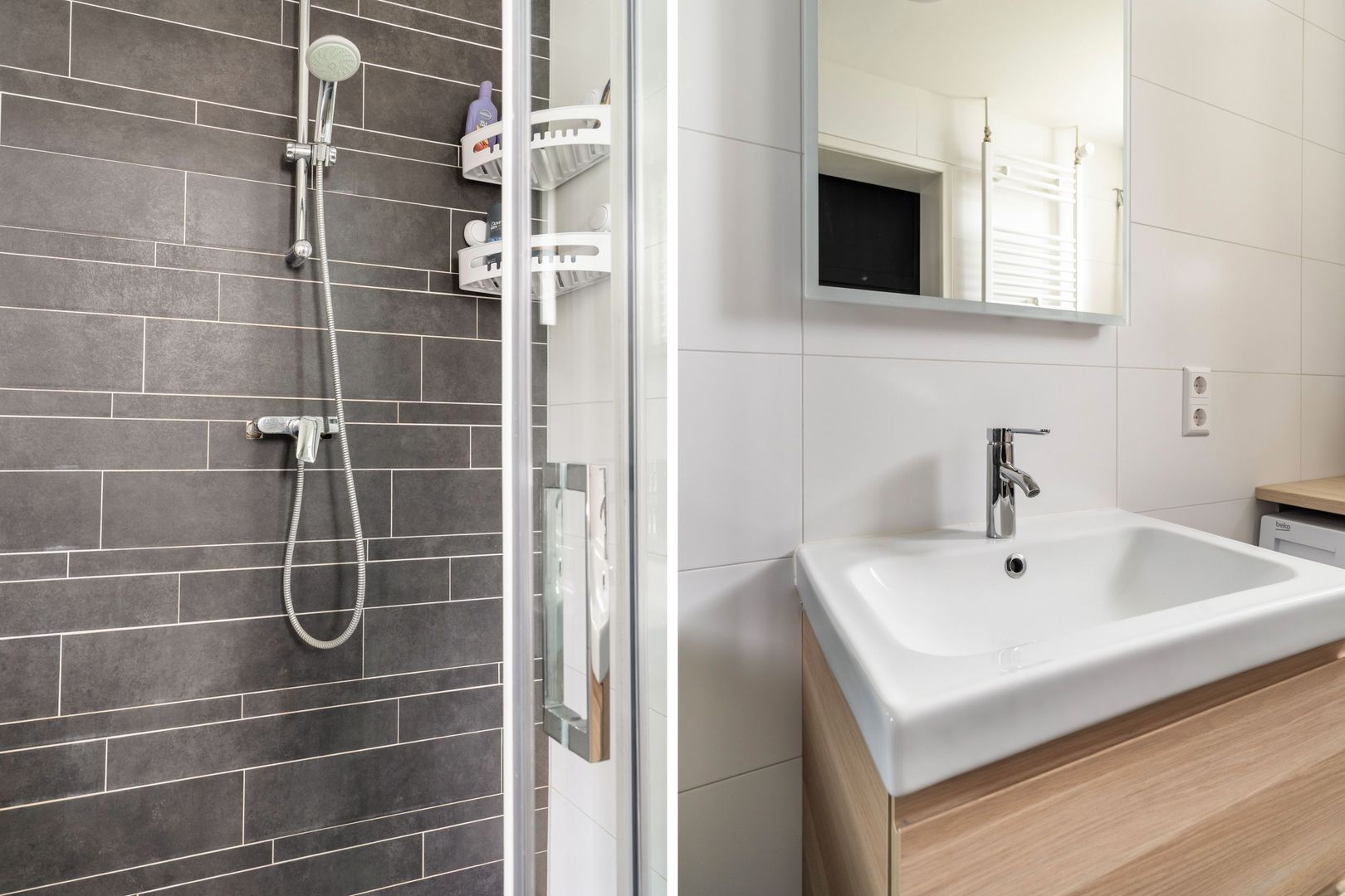 Woonkamer van bijna 19 m2 met toegang tot de slaapkamer aan achterzijde. Deze slaapkamer is ruim 11 m2 groot en heeft een dubbele vaste kast. De aan de slaapkamer grenzende moderne badkamer is geheel betegeld en uitgevoerd met een brede douche met glazen schuifdeur en een wastafelmeubel. Ook de wasmachine, droger en CV-ketel zijn in de badkamer ondergebracht.