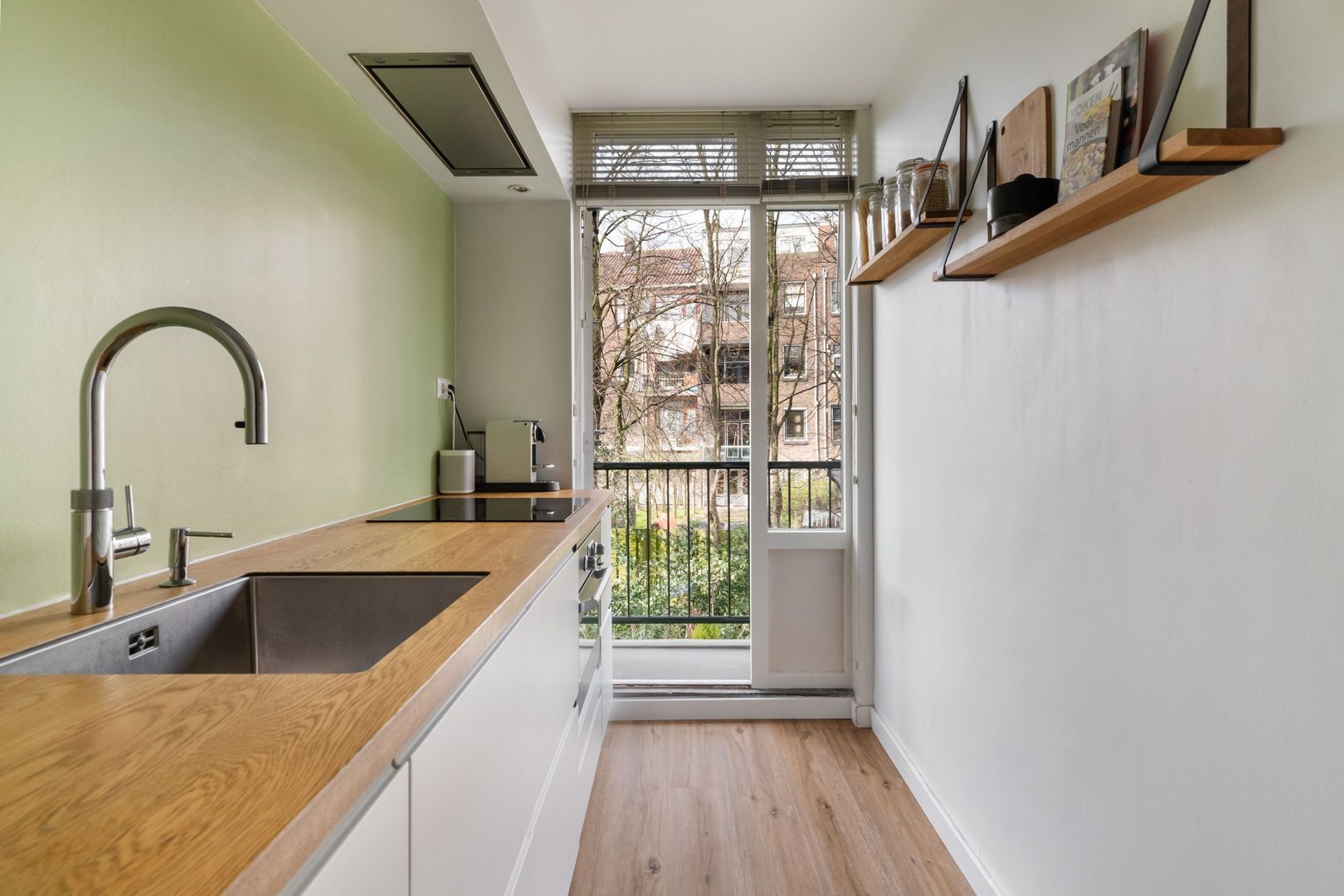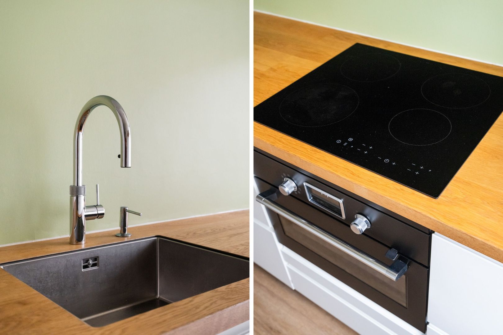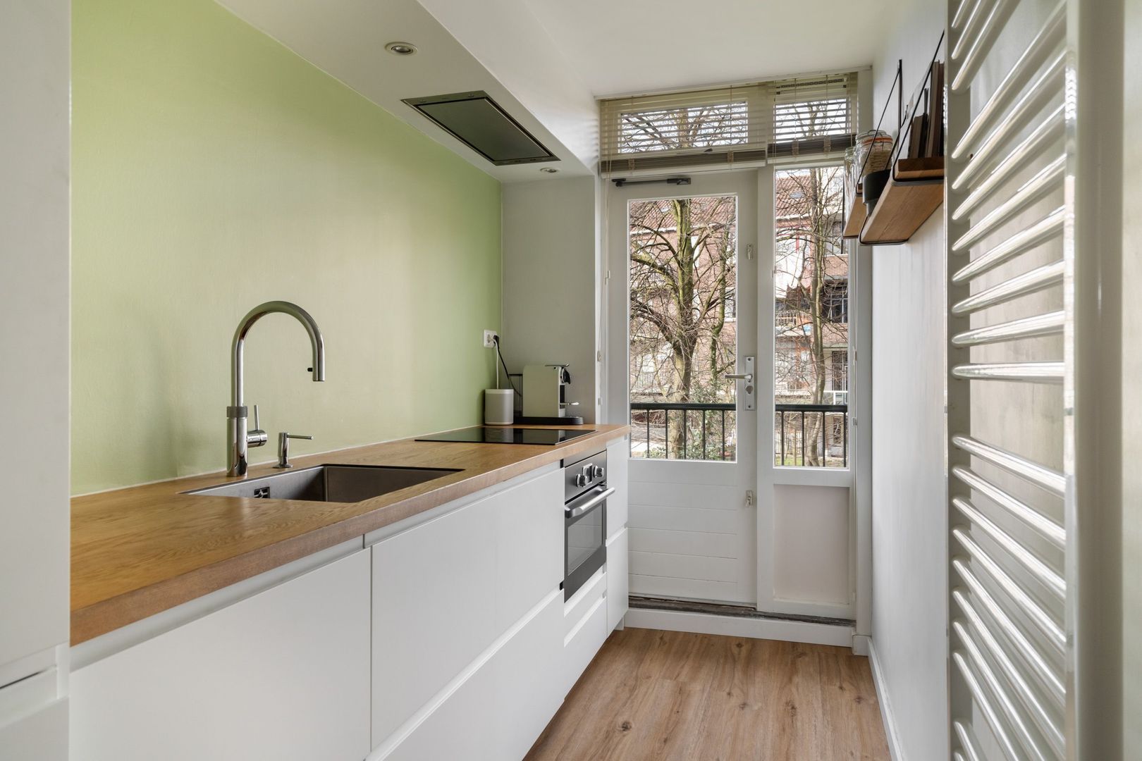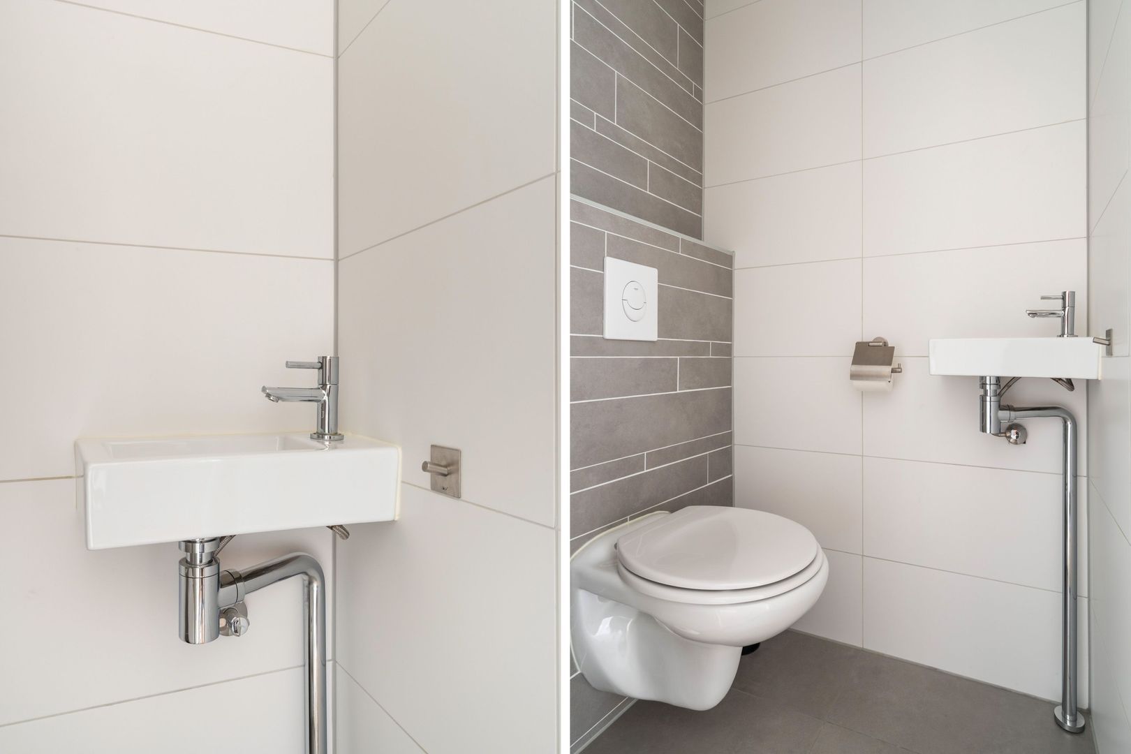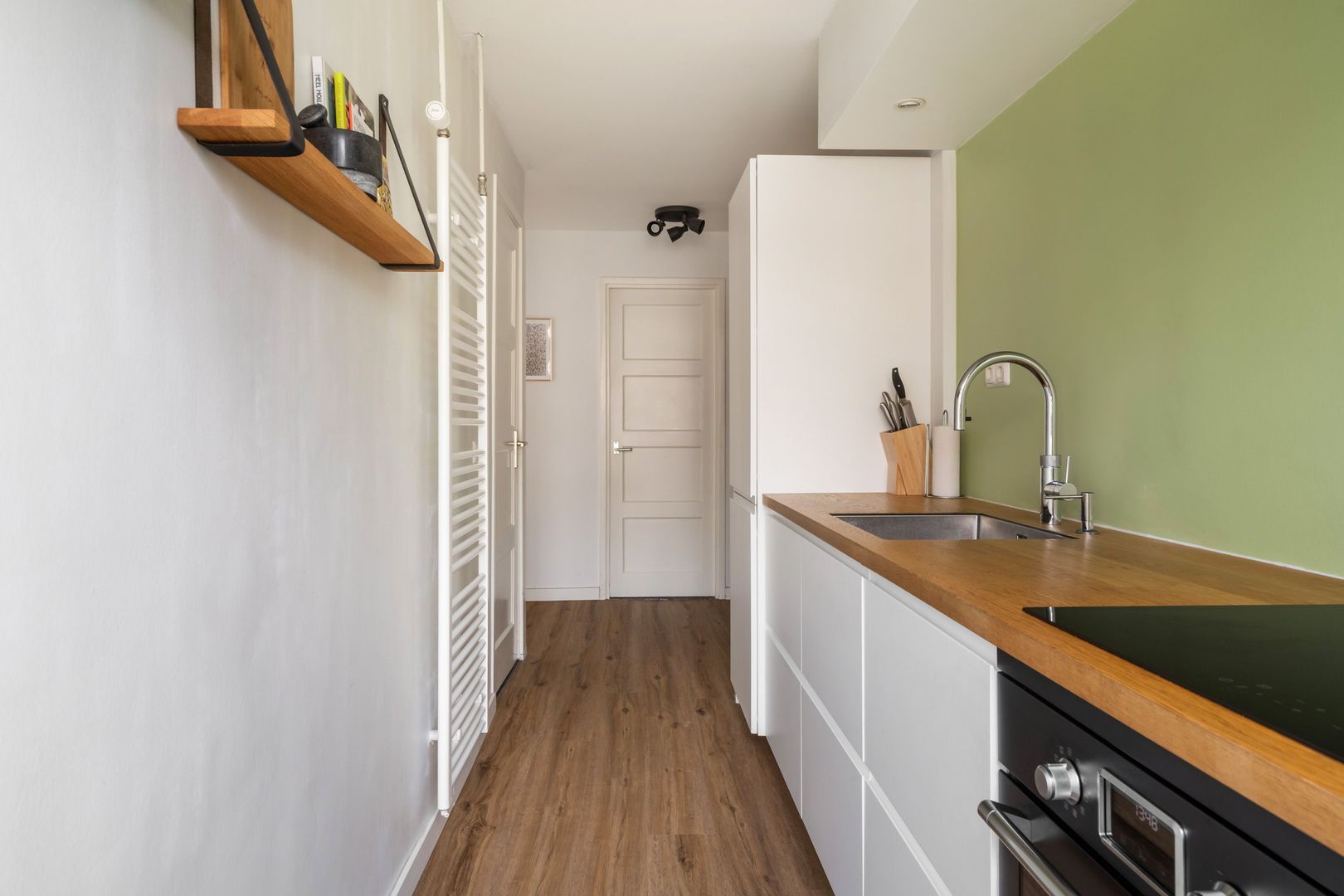 Entree van de woning. Open, aan de keuken verbonden hal. Geheel betegeld vrijhangend toilet met fontein en elektrische ventilator. Keuken van ca. 7 m2 met wandradiator, gedeeltelijk inbouwspots en modern en neutraal keukenblok met zeeppompje en de volgende apparatuur: koelkast, vriezer, inductie kookplaat, afzuigkap, Quooker, combimagnetron en vaatwasser. Vanuit de keuken geeft een deur toegang tot het balkon van bijna 3 m2.