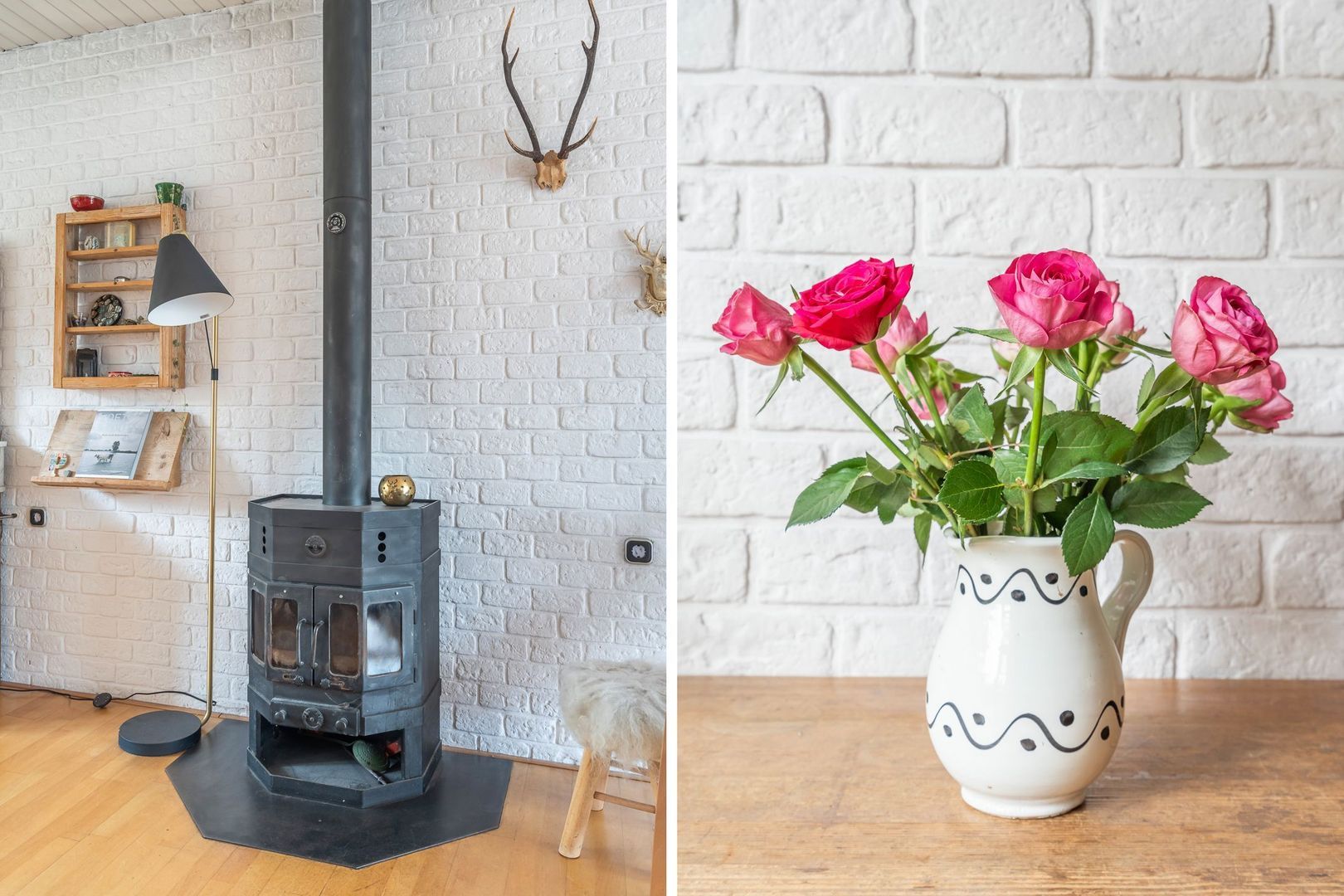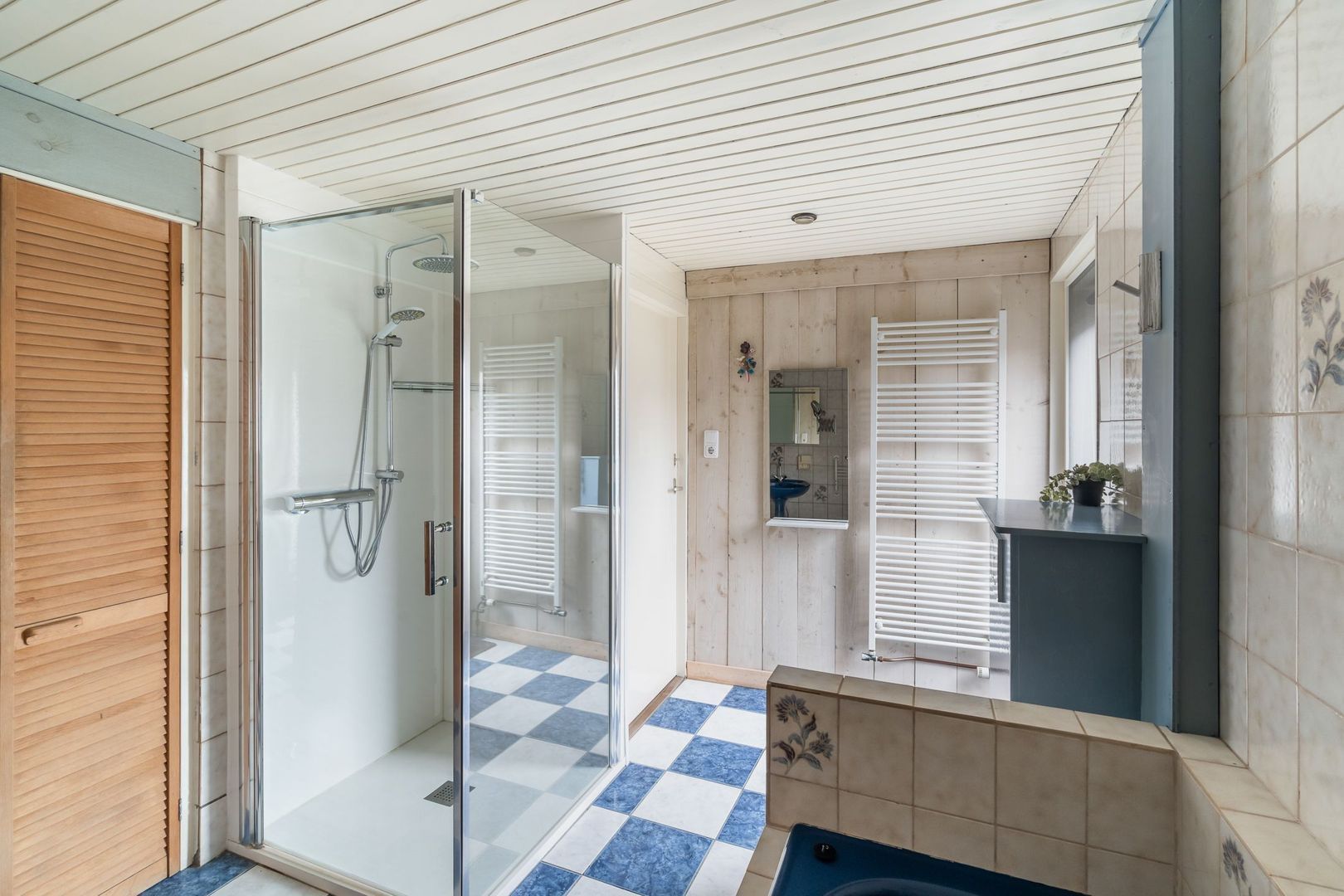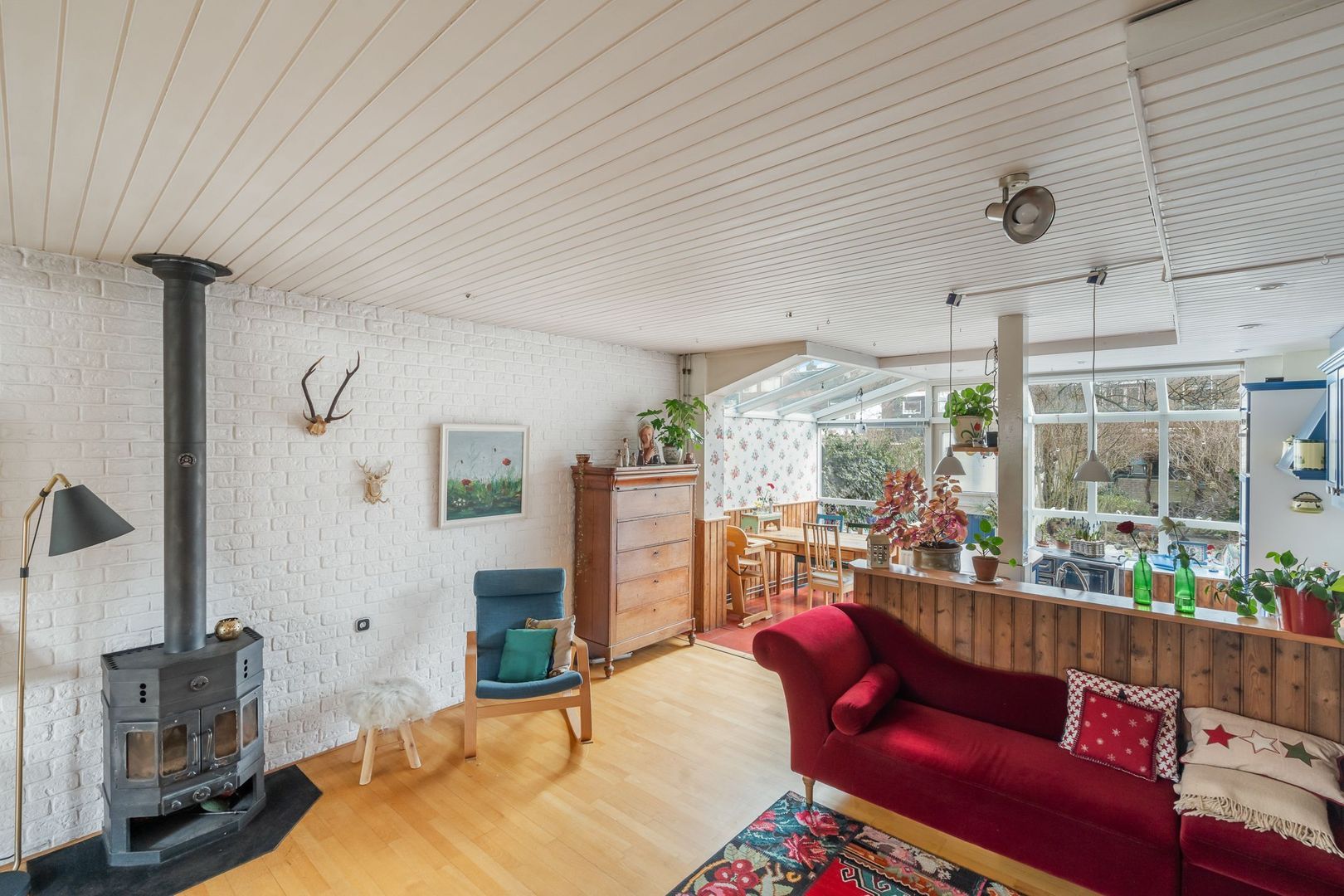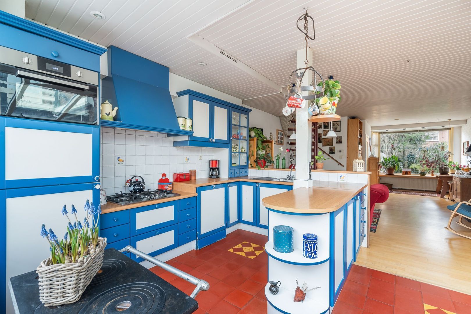 Entree met hal, meterkast, verzorgd hangend toilet met fonteintje. Royale woonkamer van 46 m² met parketvloer, sfeervolle houtkachel, houten plafond, deels steenstripwand, open spiltrap naar de verdieping, aan de achterzijde uitgebouwd met serre, betegelde vloer, keukenopstelling en mooi vrij uitzicht richting de tuin. De open keuken in U-vormige opstelling heeft een sfeervolle landhuisstijl en is voorzien van een 5-pits gaskookplaat, heteluchtoven, koelkast, aansluitpunt voor vaatwasser, 10 liter elektrische boiler en buffetkast.