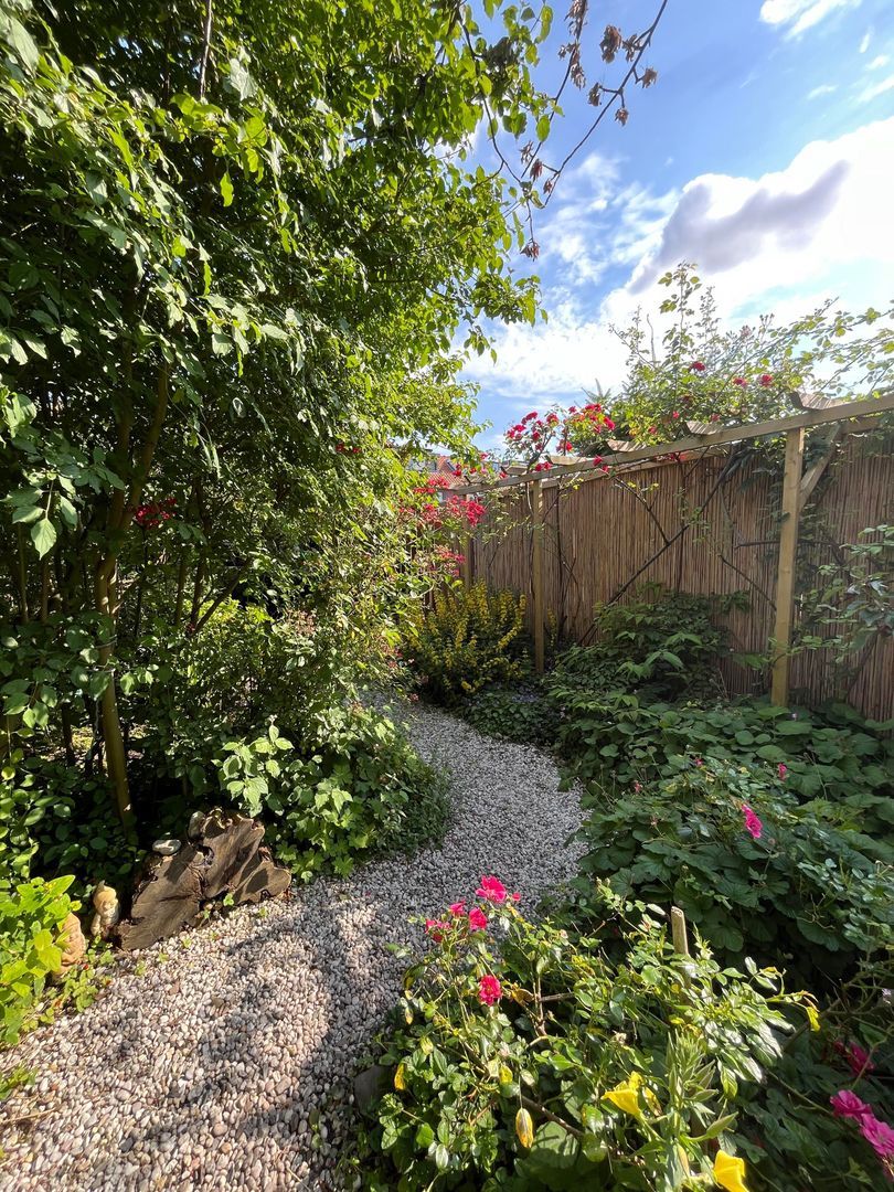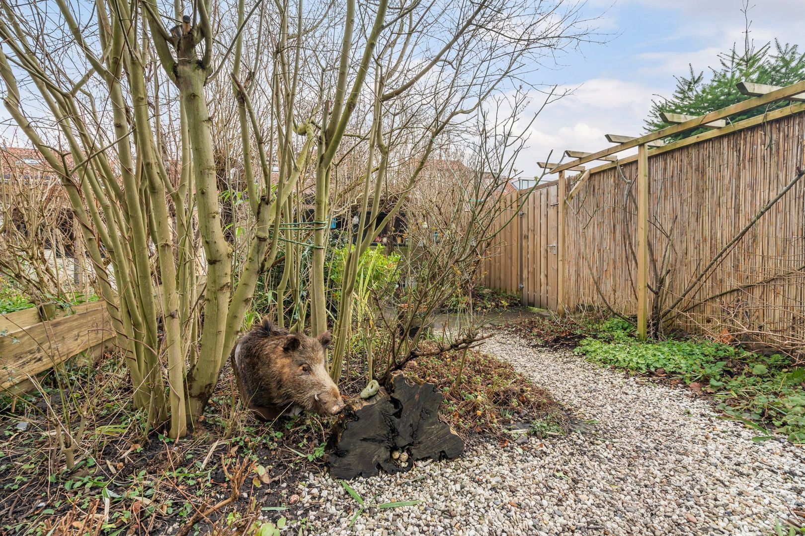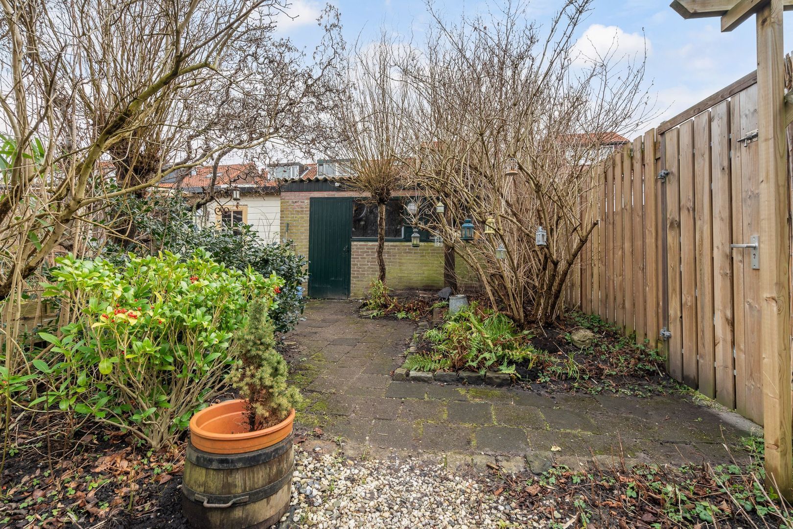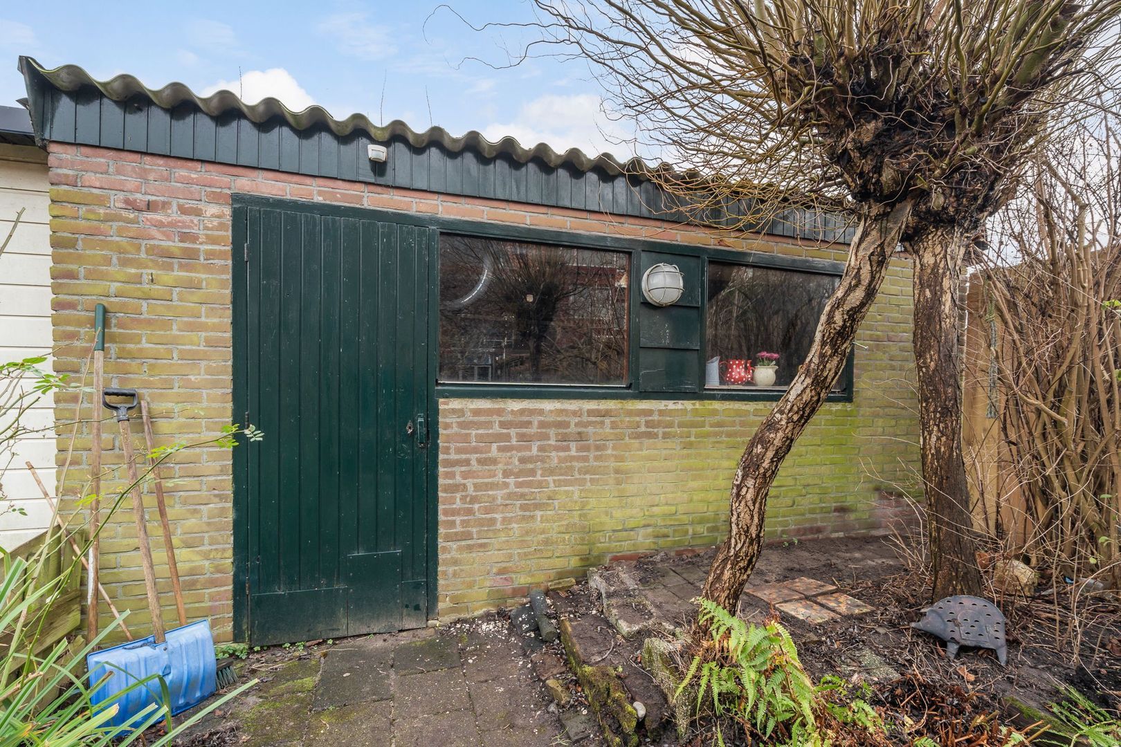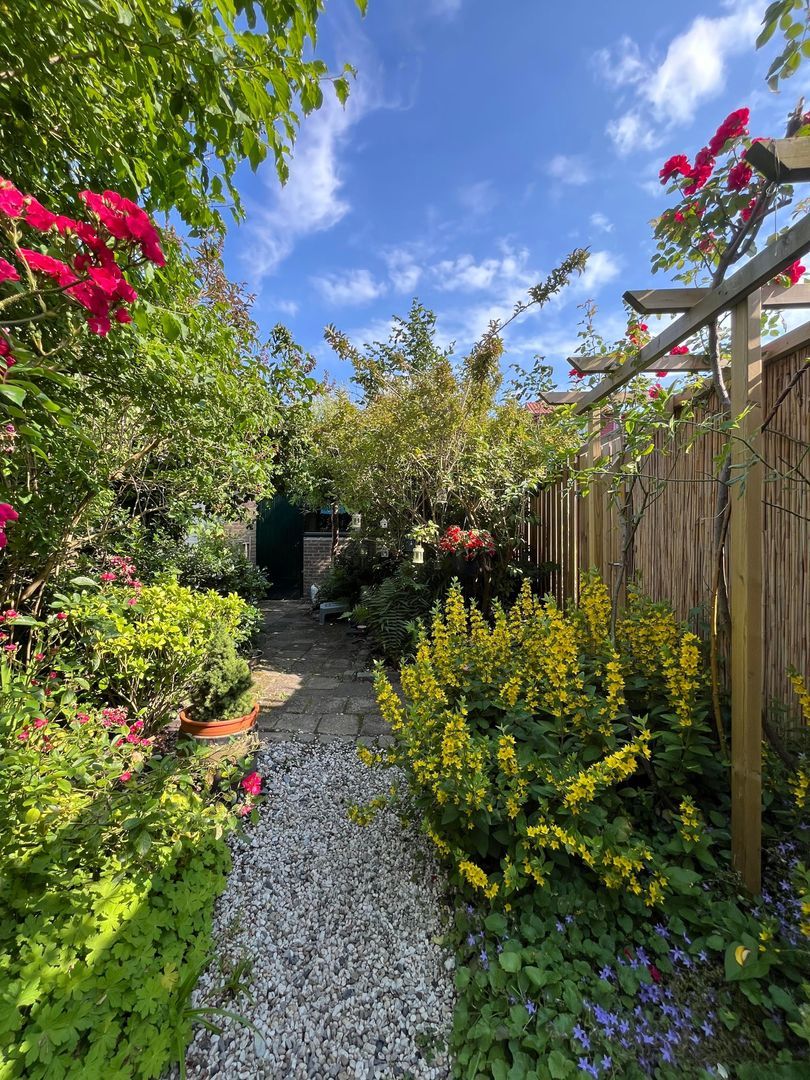 Zonnige, 16 meter diepe achtertuin op het zuiden gelegen, met veel groen, achterom, nieuwe schuttingen en grote stenen berging van bijna 12 m², voorzien van elektra.