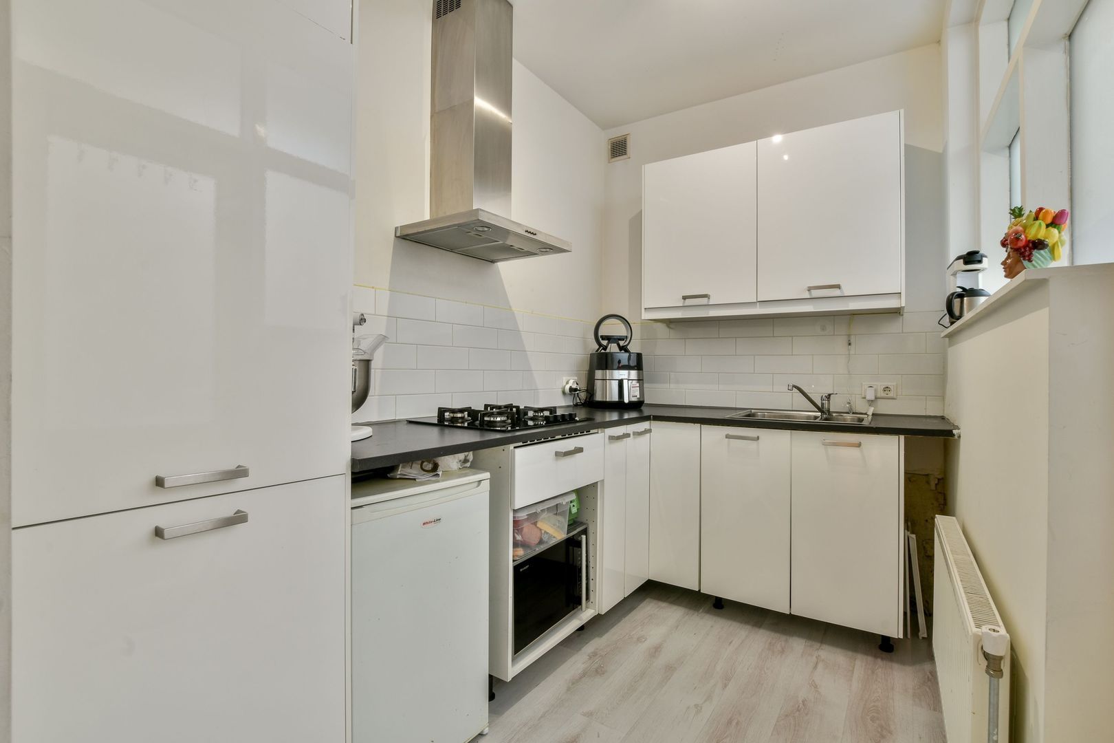 Dichte keuken met toegang naar de tuin en een keukenblok in hoekopstelling. De keuken is voorzien van een koel-/vriescombi, 4-pit gaskookplaat en een afzuigkap.