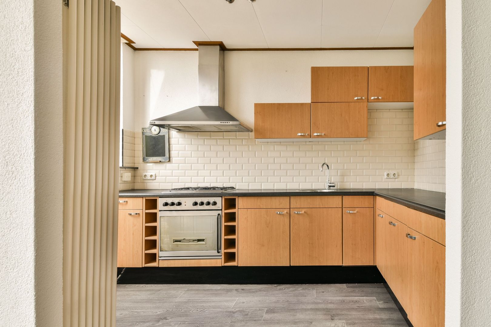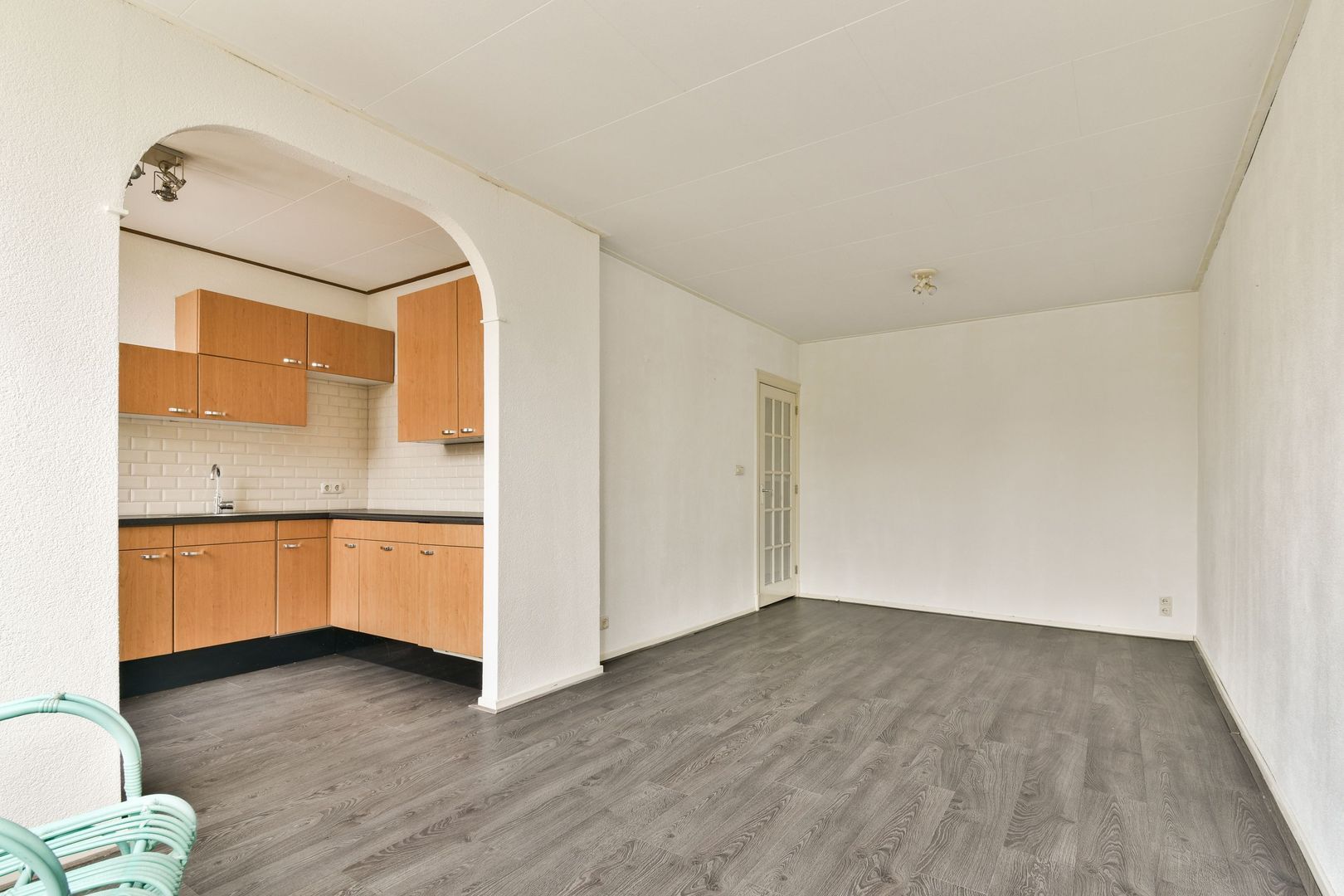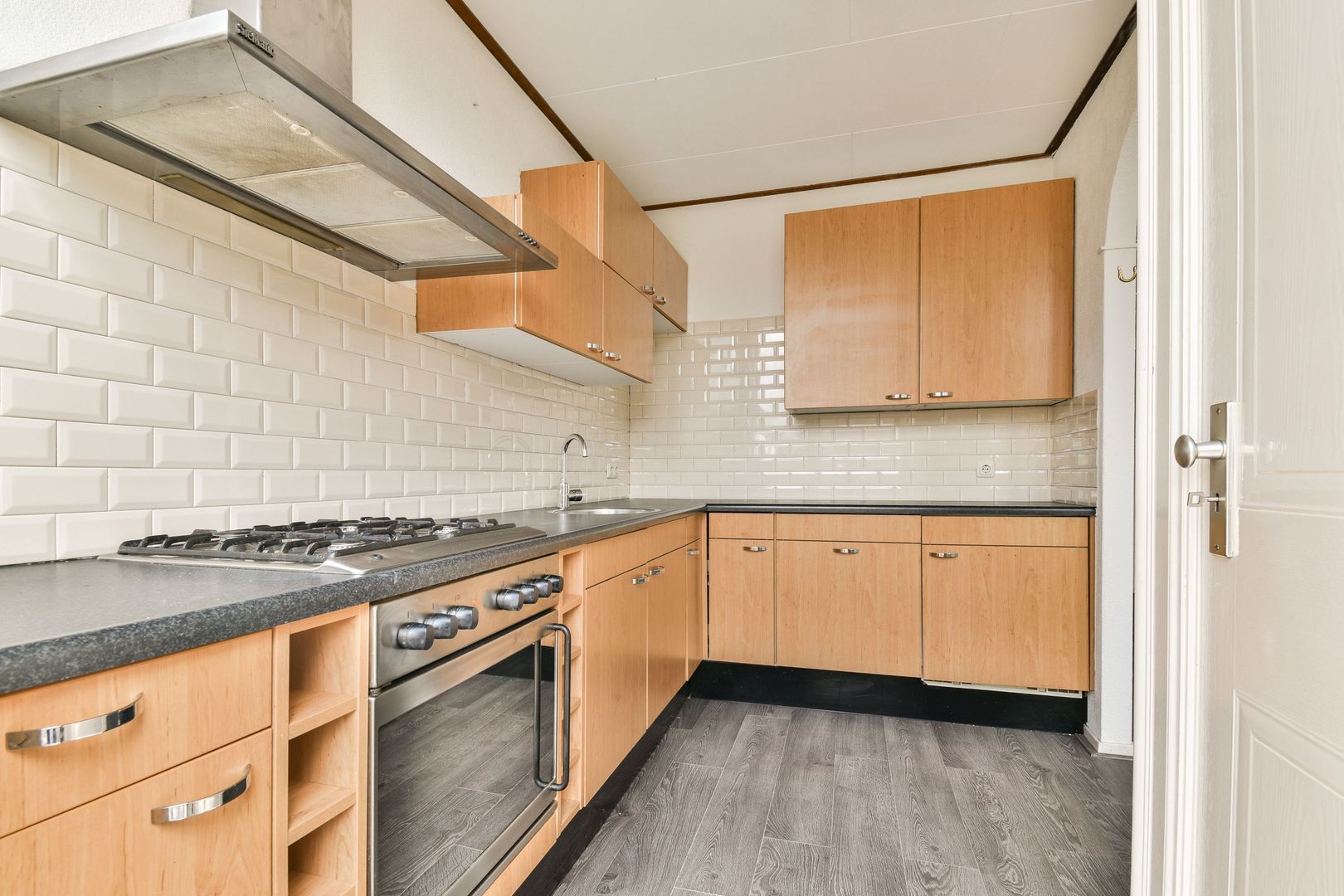Woonkamer van ca. 20m2 aan tuinzijde met aansluitend de half open keuken van bijna 7 m2 met een deur naar de tuin. In een vaste kast zit de CV-combiketel en het keukenblok in hoekopstelling en voorzien van 4-pits gaskookplaat, afzuigkap, oven, vaatwasser en koelkast.