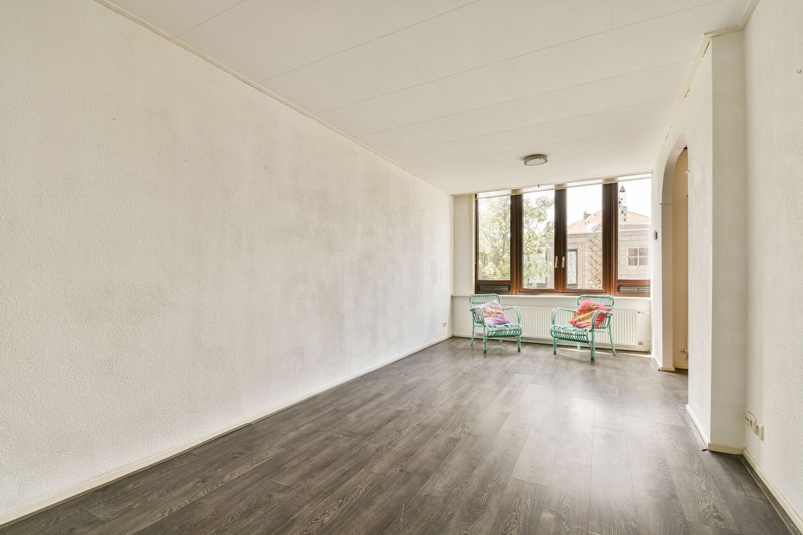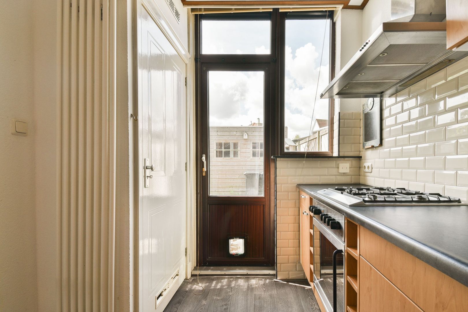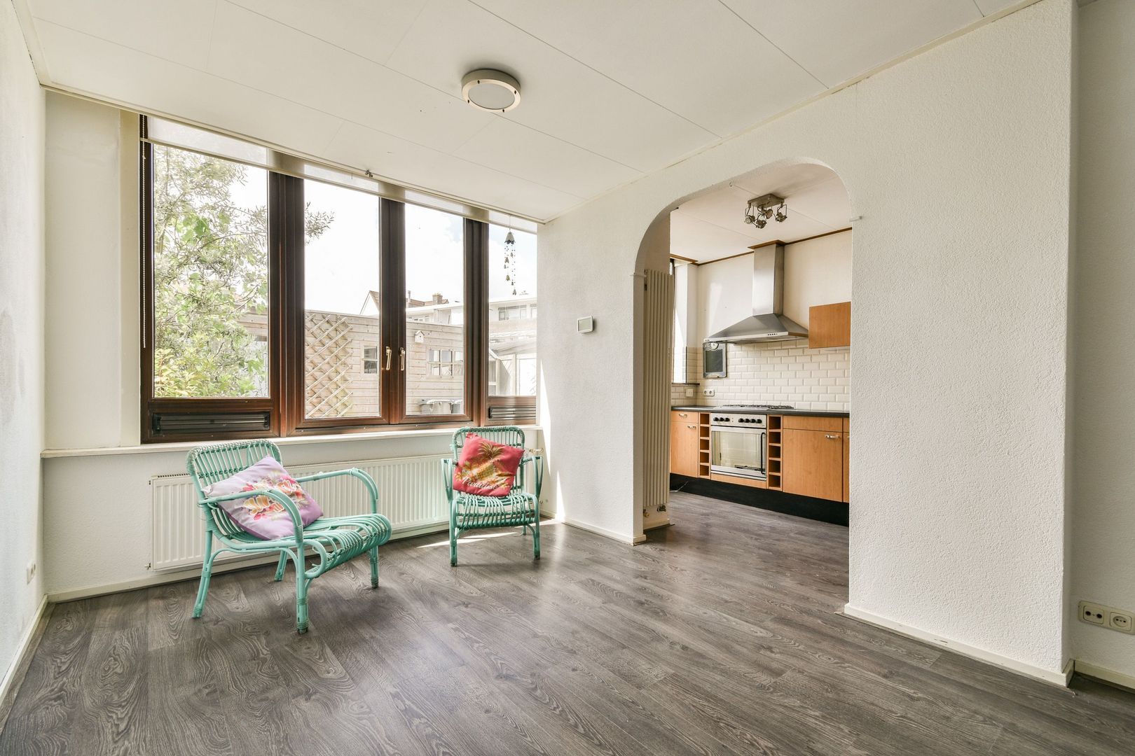 Woonkamer van ca. 20m2 aan tuinzijde met aansluitend de half open keuken van bijna 7 m2 met een deur naar de tuin. In een vaste kast zit de CV-combiketel en het keukenblok in hoekopstelling en voorzien van 4-pits gaskookplaat, afzuigkap, oven, vaatwasser en koelkast.