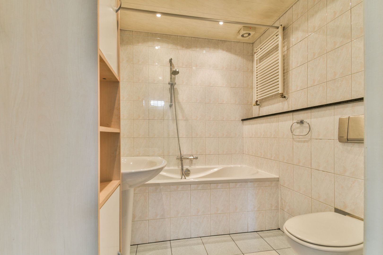 Entree, hal met meterkast. Onder de trap van de bovenwoning zit de wasmachineaansluiting en kan eventueel ook een droger geplaatst worden. Vanuit de hal toegang tot de badkamer en woonkamer. De badkamer is geheel betegeld en voorzien van een ligbad, wastafel en toilet.