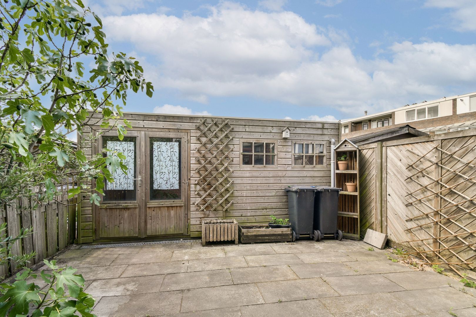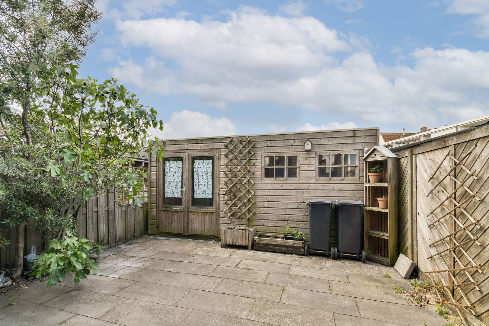 Zonnige op het zuid-westen gelegen achtertuin van ca. 4.60m diep en 5,20m breed met grote houten berging van ca. 13 m2. Via de berging is de achterom bereikbaar