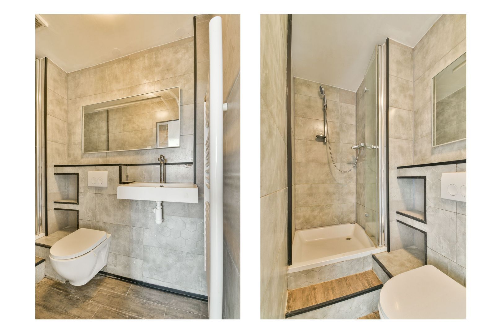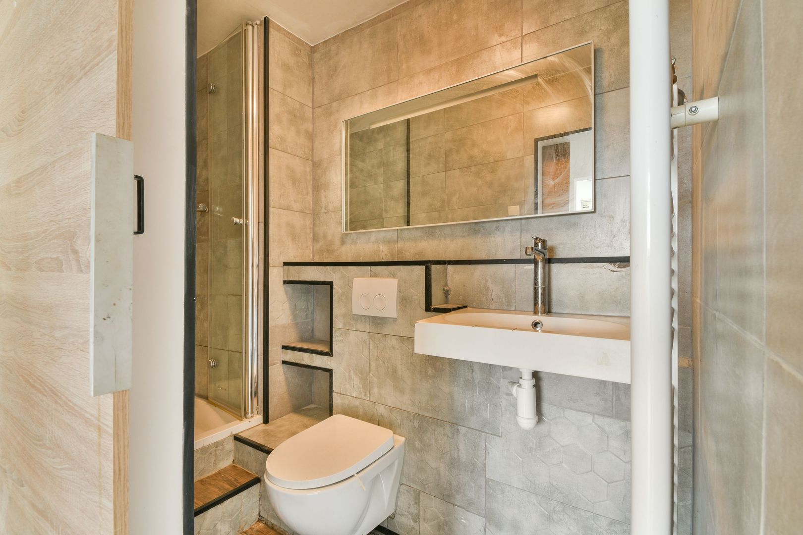 Badkamer met moderne tegelwerk tot plafond met inloopdouche met scherm en thermostaatkraan, hangend toilet en wastafel met grote spiegel, mechanische ventilatie en handdoekenradiator.