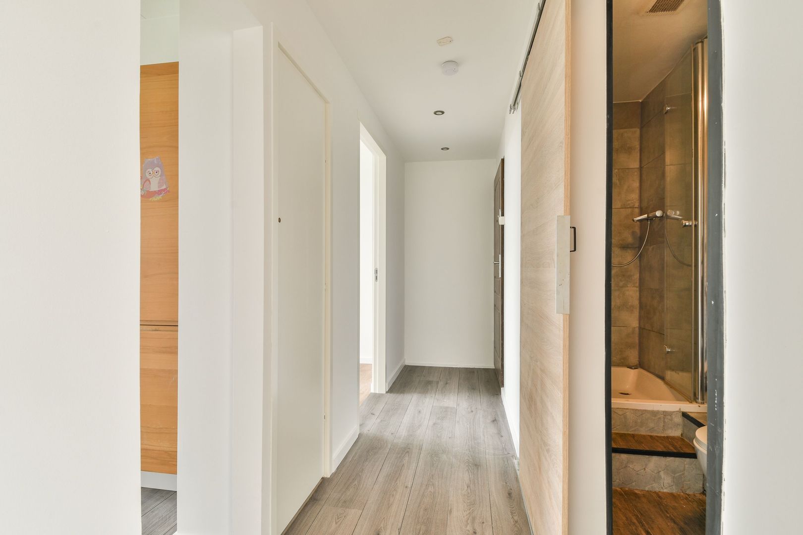 Entree gang hal met meterkast en plafond met ingebouwde verlichting. Royale en lichte woonkamer van ca. 23 m2 met grote kunststof ramen en wit afgewerkte wanden en plafond, aansluitend slaapkamer van 11 m2 met toegang naar balkon. De keuken met houtlookfront, in greeploze uitvoering, is voorzien van koel-vrieskast, 4 pits gaskookplaat, afzuigkap en hetelucht oven, betegelde achterwand en aansluitpunt wasmachine. Groot kunststof raam met vrij uitzicht daarnaast is er vanuit de keuken ook toegang naar het balkon.
