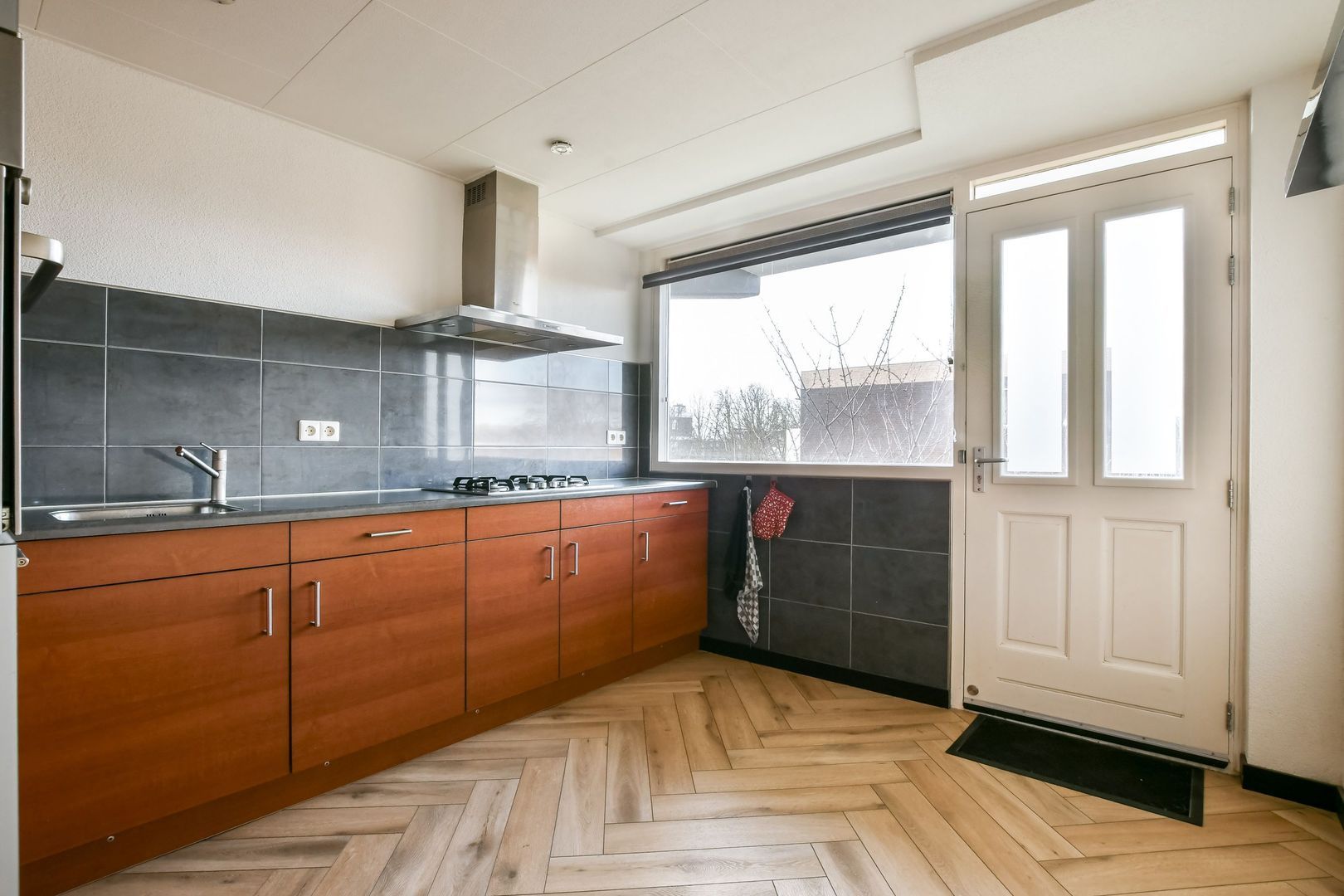 Entree in de keuken van ruim 10 m2. Deze ruimte is ontstaan door het toevoegen van de voormalige hal aan de keuken. Er zijn inbouwspots en het keukenblok in hoekopstelling is uitgevoerd met veel bergruimte, 4-pits gaskookplaat, afzuigkap, combi magnetron en koelkast met vriesvak. In een keukenkast is ook de CV-combiketel weggewerkt.