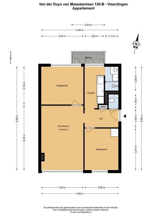 Entree woning, hal, meterkast. Geheel modern betegeld toilet met hangend closet, fonteintje, inbouwspots en elektrische ventilator. Ruime woonkamer van bijna 20 m² met gaskachel, toegang tot de slaapkamer en leuk groen uitzicht over de omgeving. De slaapkamer aan voorzijde is ruim 11 m² groot, is voorzien van een kastenwand en heeft een deur naar het balkon. De tweede slaapkamer van ca. 9,5 m² ligt aan de achterzijde van de woning. Ook deze kamer heeft een vaste kastenwand. De keuken aan de voorzijde van bijna 6 m2 is uitgevoerd met een modern neutraal wandblok met de volgende apparatuur: inductiekookplaat, afzuigkap, combi-magnetron en koelkast met vriesvak. Vanuit de keuken is ook het balkon te benaderen en is toegang tot de badkamer/doucheruimte. Deze is net als het toilet geheel modern betegeld en voorzien van inbouwspots en een elektrische ventilator. De douche heeft een glazen deur en er is een wastafelmeubel.