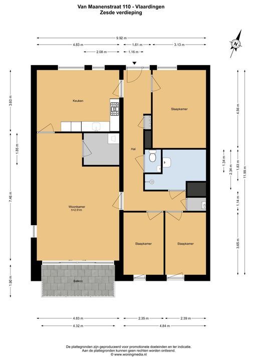 Er zijn 3 slaapkamers. De grootste slaapkamer ligt aan galerijzijde en heeft een oppervlakte van iets meer dan 14 m2. De twee andere slaapkamers liggen naast elkaar aan balkonzijde en zijn allebei bijna 9 m2 groot. Wanneer deze kamers samengevoegd zouden worden, wat eenvoudig kan, ontstaat een slaapkamer van ca. 17,5 m2 en wordt dit de hoofdslaapkamer. Tot ca. 1.80m hoog betegelde badkamer met douchehoek voorzien van deur en wastafel.