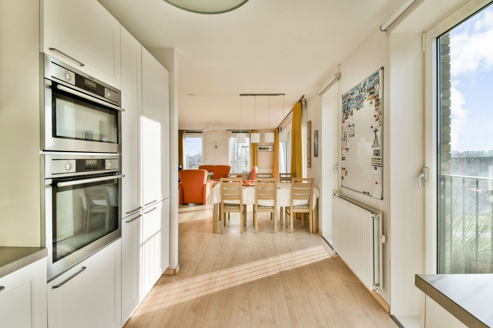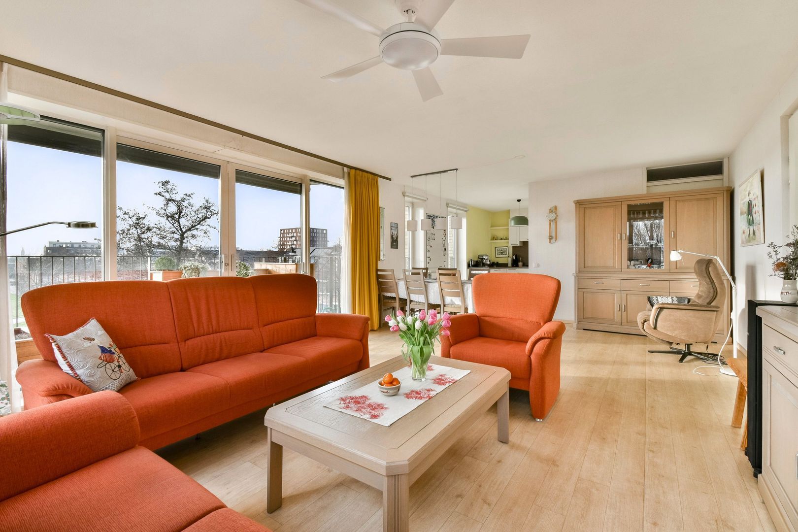 Woonkamer met open keuken van totaal ca. 45 m2. Vanuit de woonkamer geven twee schuifdeuren toegang tot het balkon van ca. 9 m2 met een Zuid-West zonligging en een elektrisch zonnescherm. De woonkamer en keuken hebben een fijne lichtinval door de vele aanwezige ramen/Franse balkons met glas dat tot aan de grond doorloopt. Het uitzicht vanuit de woning en vanaf het balkon is erg mooi.