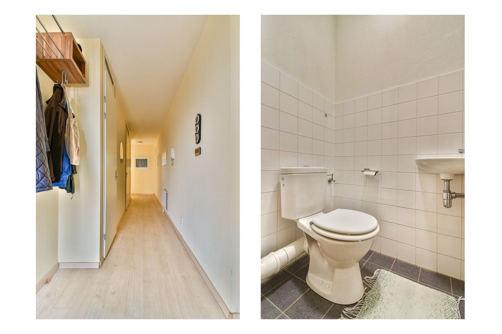 Entree, hal met videofoon en meterkast. Gedeeltelijk betegeld toilet met fontein. Vaste kast met CV-combiketel en unit mechanische ventilatie. Via de hal toegang tot alle vertrekken van de woning.