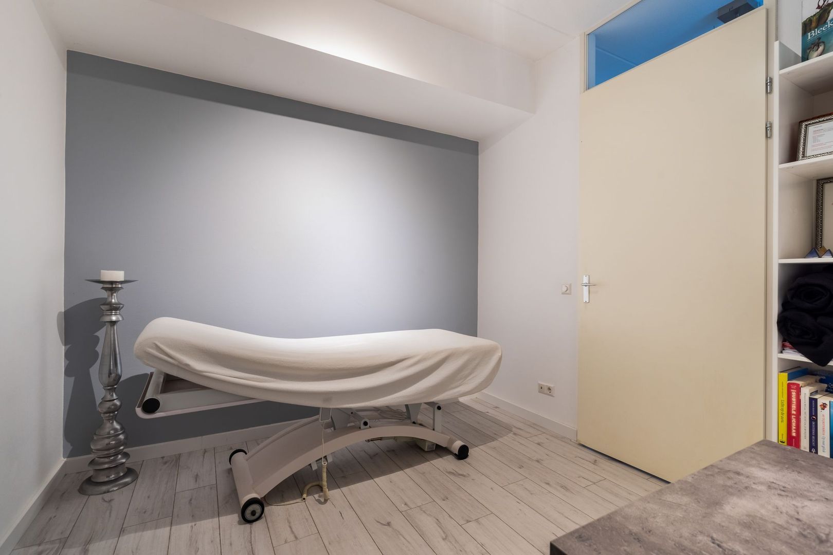 Entree, vanuit parkeergarage met ruime hal, moderne hangend toilet met fonteintje en mooie wandtegel, ruime verwarmde berging/praktijkkamer van 16 m2 met water aansluiting en afvoer. Tuinkamer van 38 m2 met trapkast en 2 openslaande deuren naar het fantastische terras aan het water met eigen steiger.