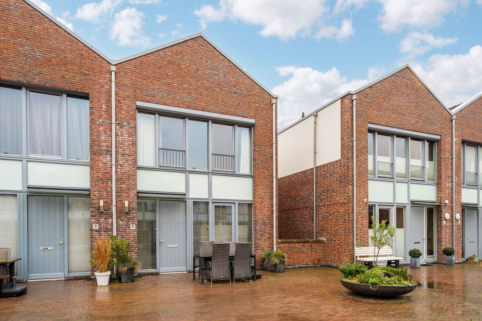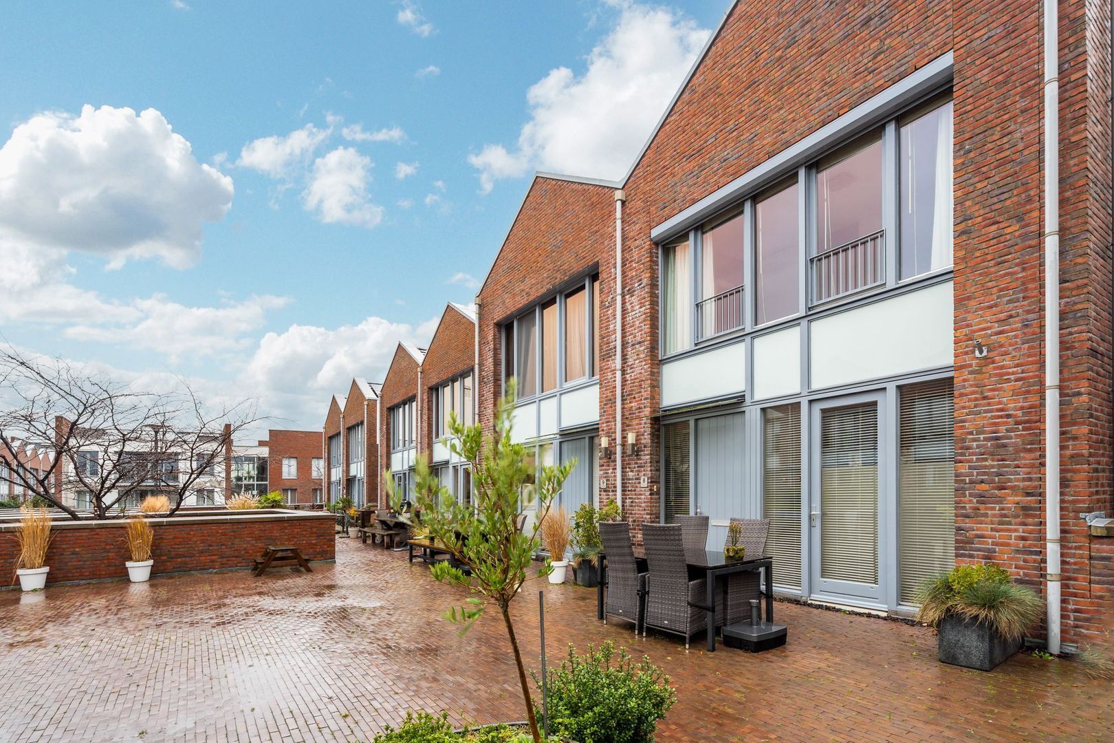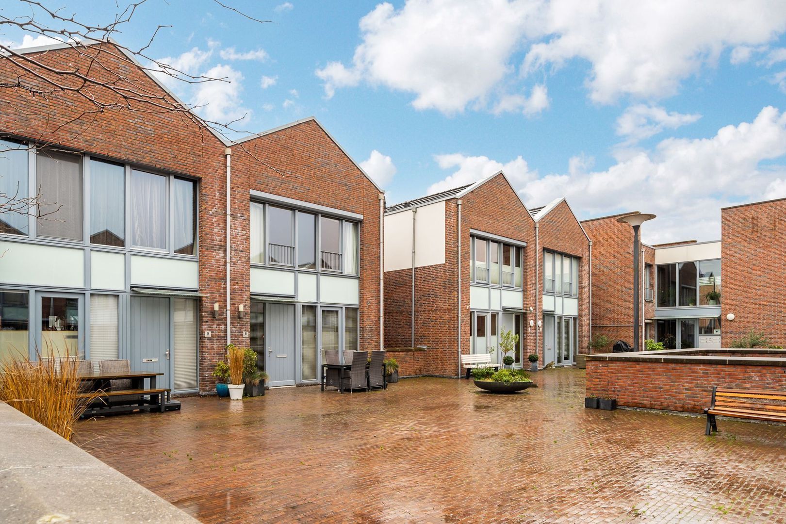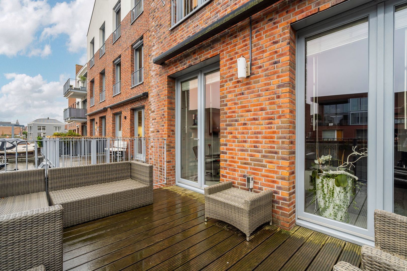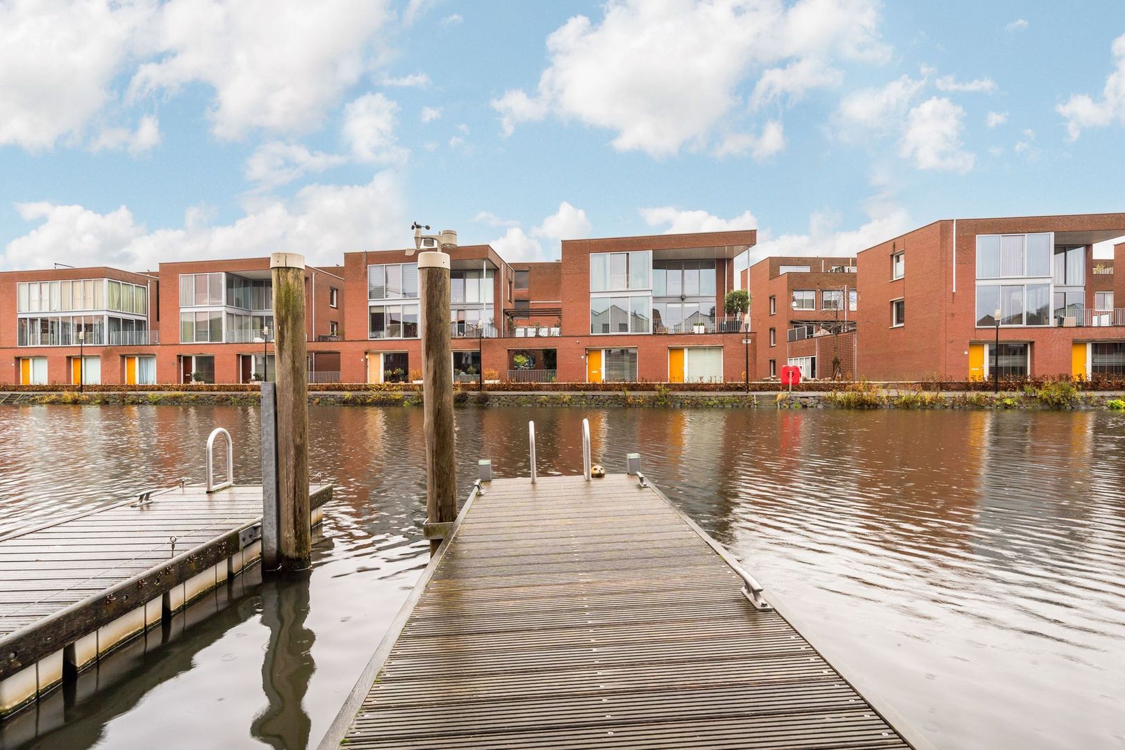 Voorzijde gelegen aan grote gemeenschappelijke binnentuin. Aan waterzijde voorzien van eigen terras van 11,5 m2 met bankirai vloerdelen, boven het water gelegen en vrij uitzicht over het Buizengat, met eigen bootsteiger.