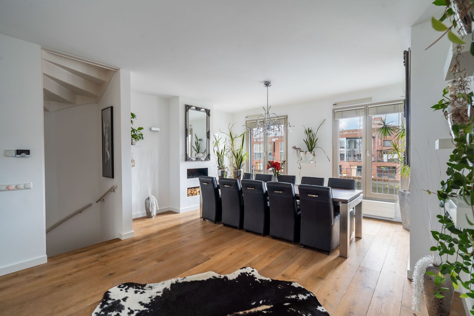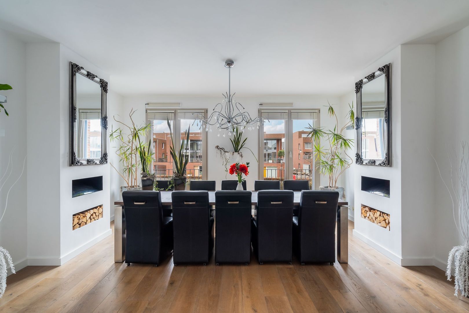 Entree vanuit binnenplein, ruime hal, meterkast, schitterend hangend 2e toilet met fonteintje en fraaie wandtegel. Zeer royale woonkamer met open keuken van 43 m2 met hoge binnen deuren, vrij zicht op de haven en dijk. Luxe Siematic design keuken, greeploos, met kookeiland voorzien van granieten aanrechtblad en de navolgende inbouwapparatuur; rvs afzuigschouw, inductie kookplaat, vaatwasser, magnetron, hetelucht combi oven, koelkast en 4 laden vriezer. Mooie eiken houten vloer, gladstuc wanden en aan 2 zijden een sfeervolle elektrische openhaard met schouw. De screens houden ’s zomers de warmte goed buiten.