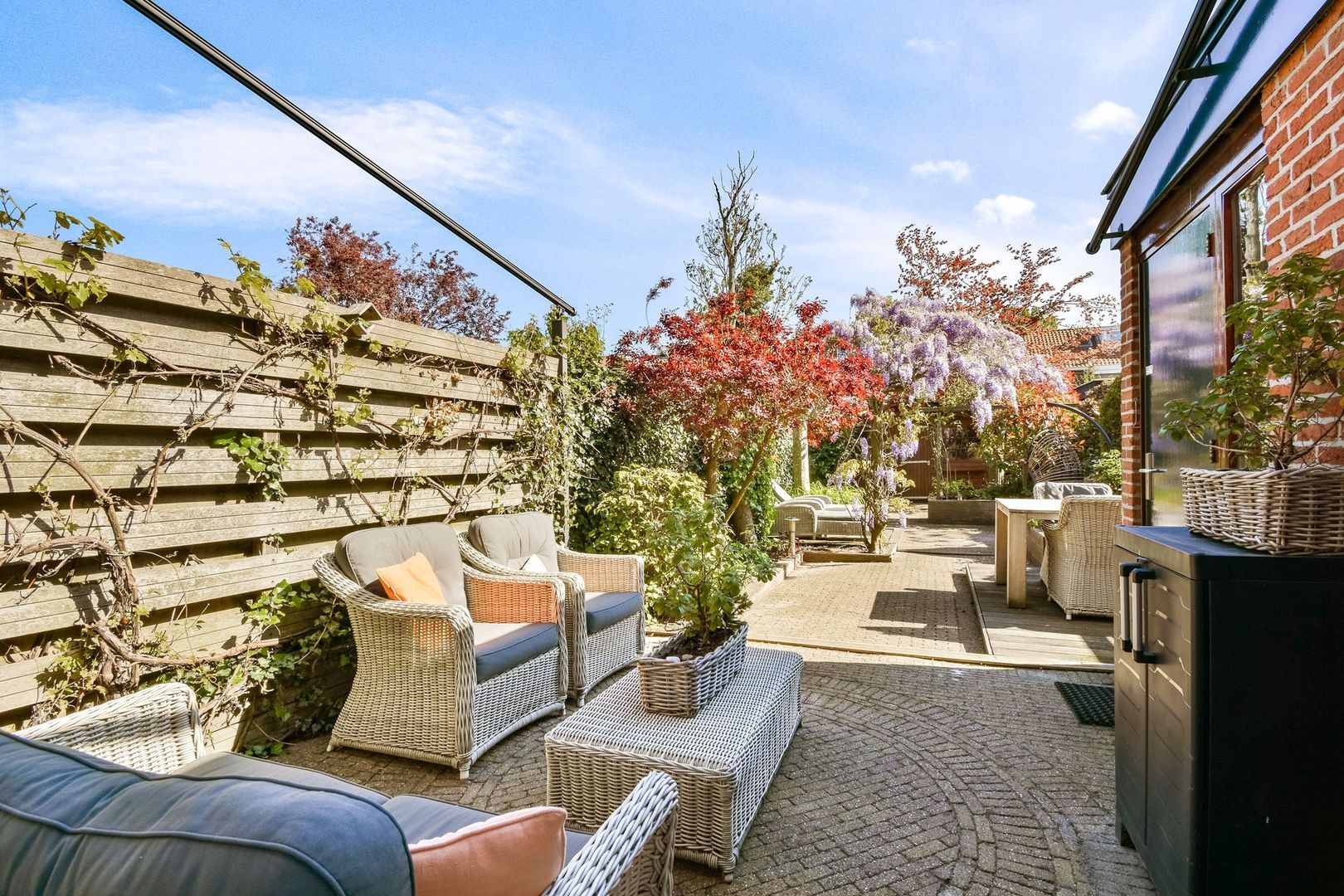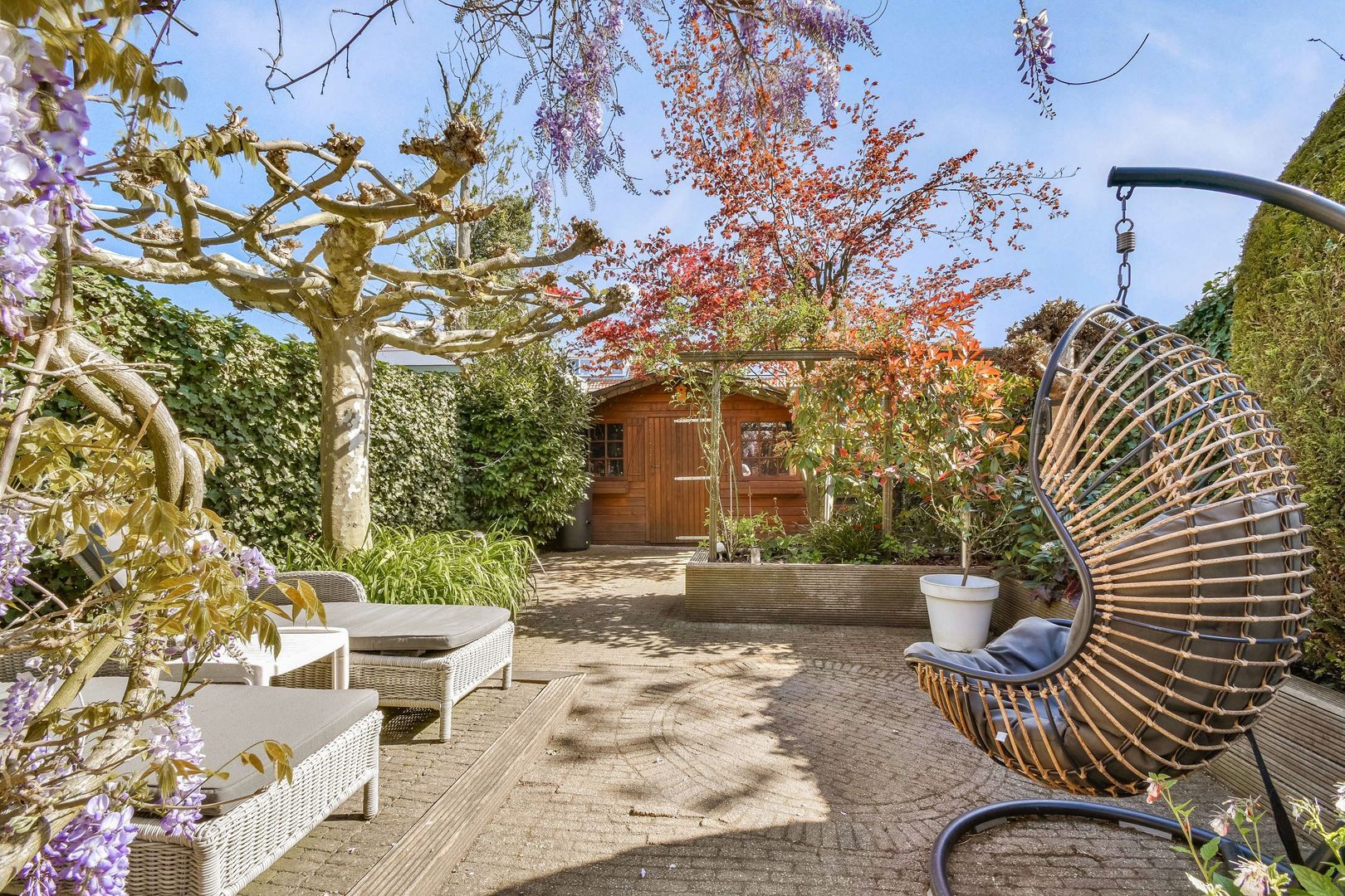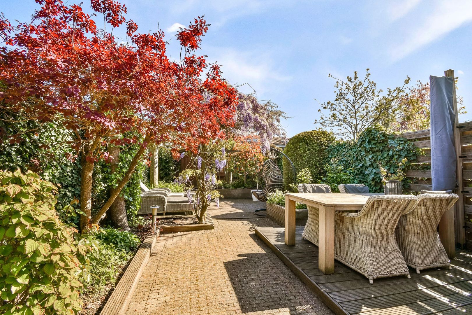Heerlijk op het zonnige zuiden gelegen achtertuin. De tuin is gevarieerd aangelegd met diverse zitjes en veel blijvend groen. Achterin de tuin staat een grote houten chaletschuur van ca. 12 m2 voorzien van elektra, en er is een achterom. De tuin is 6 meter breed en bijna 20 meter diep. Verzorgde voortuin van ca. 5 meter diep, ook met veel groen.