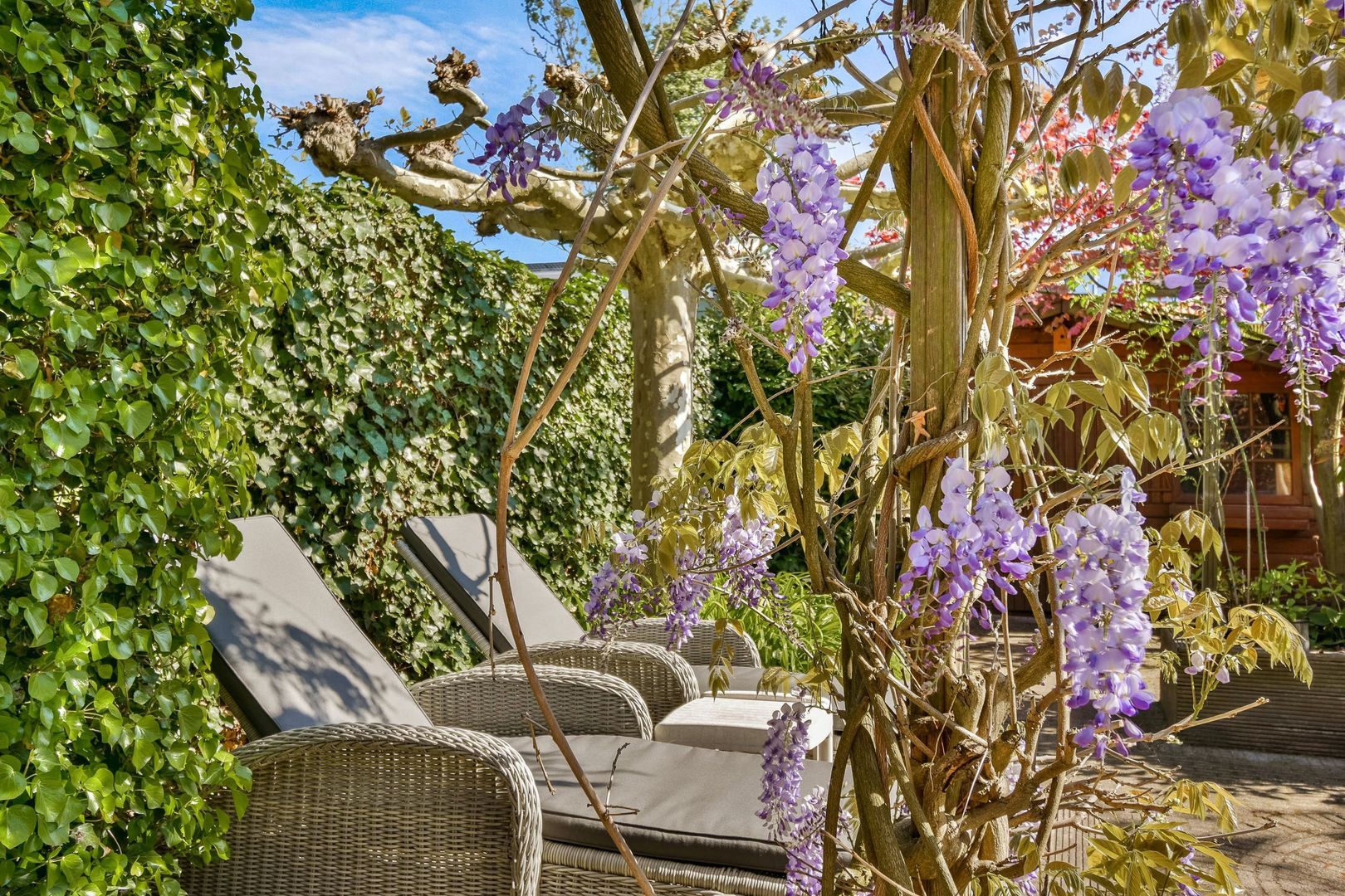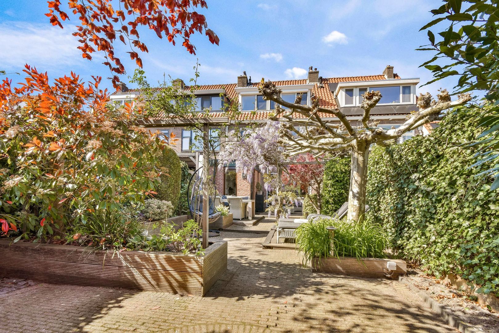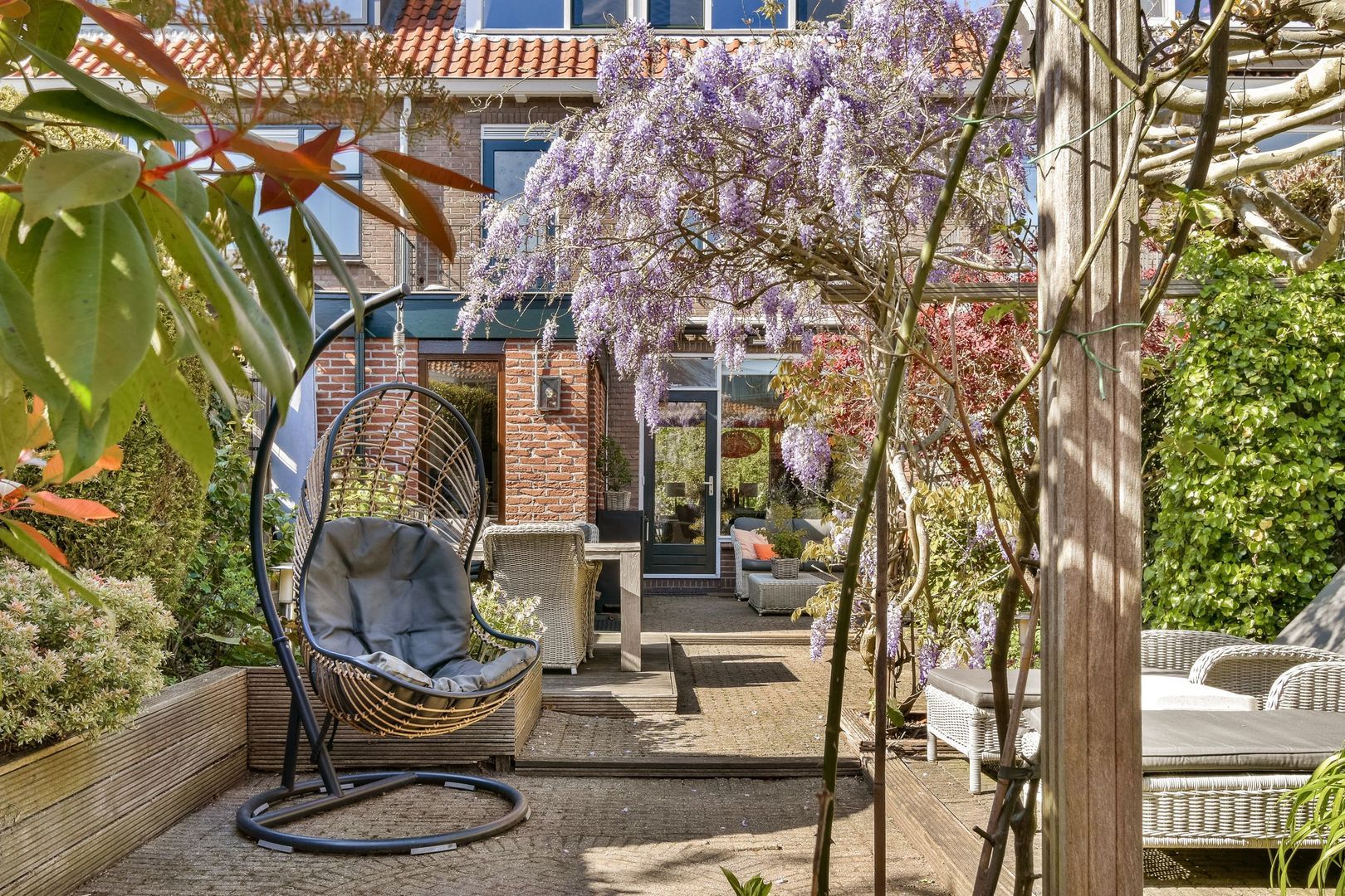 Heerlijk op het zonnige zuiden gelegen achtertuin. De tuin is gevarieerd aangelegd met diverse zitjes en veel blijvend groen. Achterin de tuin staat een grote houten chaletschuur van ca. 12 m2 voorzien van elektra, en er is een achterom. De tuin is 6 meter breed en bijna 20 meter diep. Verzorgde voortuin van ca. 5 meter diep, ook met veel groen.