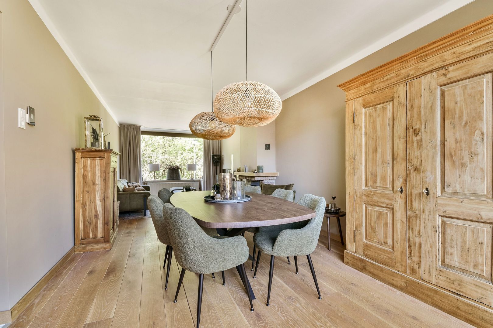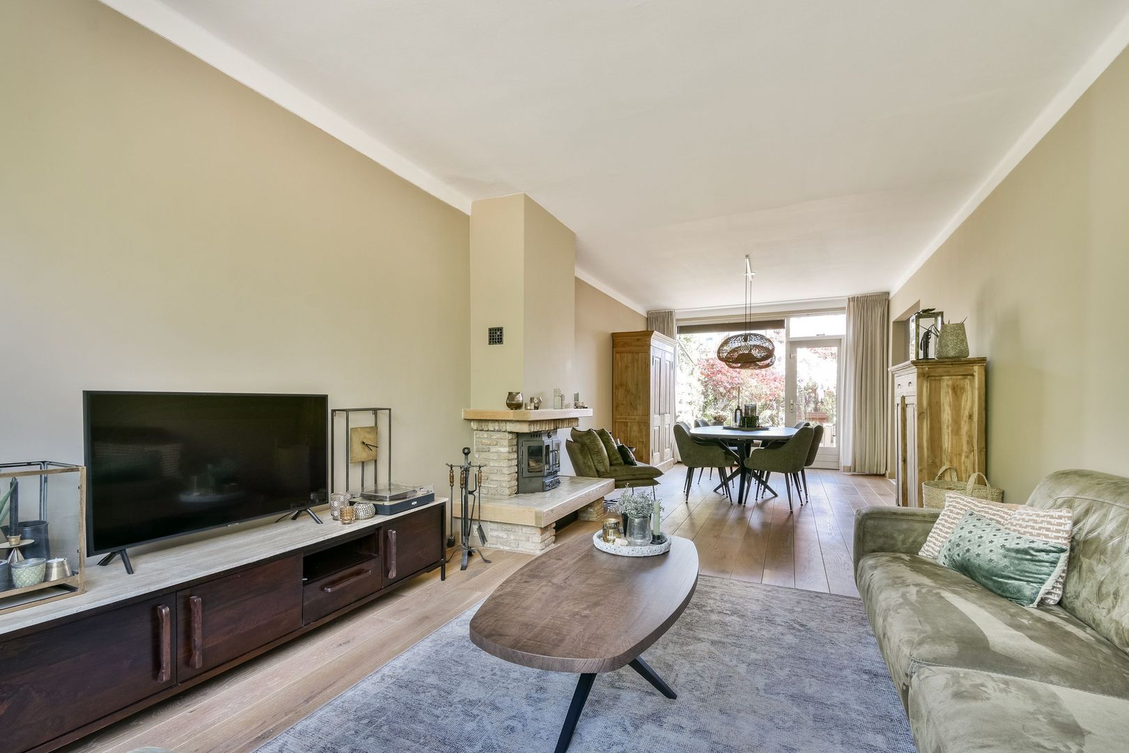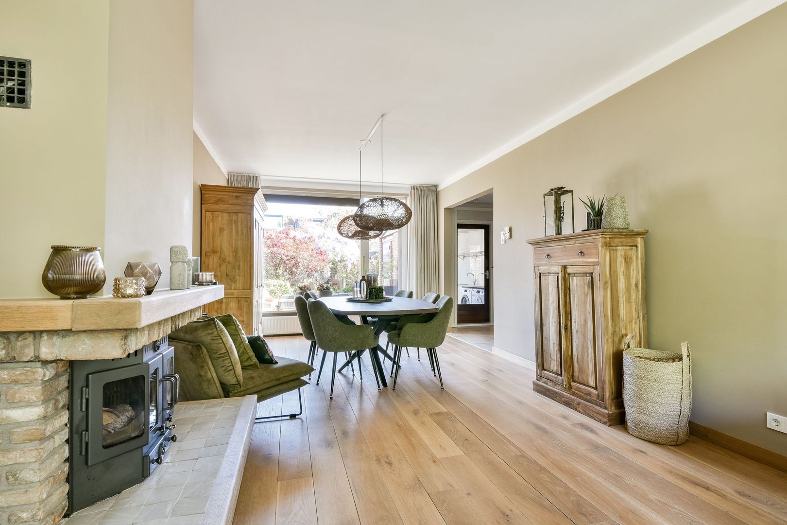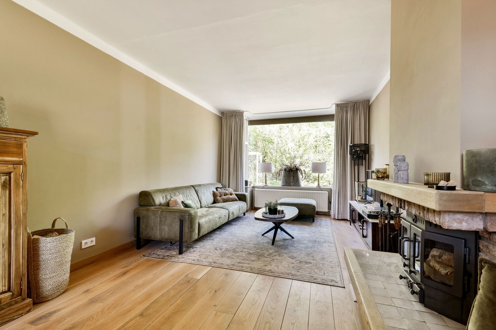 In de fijne doorzonwoonkamer ligt een mooie massief eiken geoliede parketvloer, er is een erker met vrij uitzicht de straat in, een Barbas open haard met warmte terugwinning, gladstuc wanden en plafond.