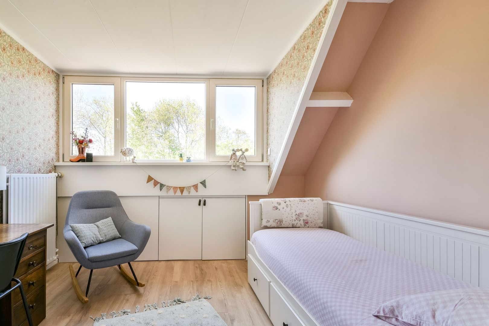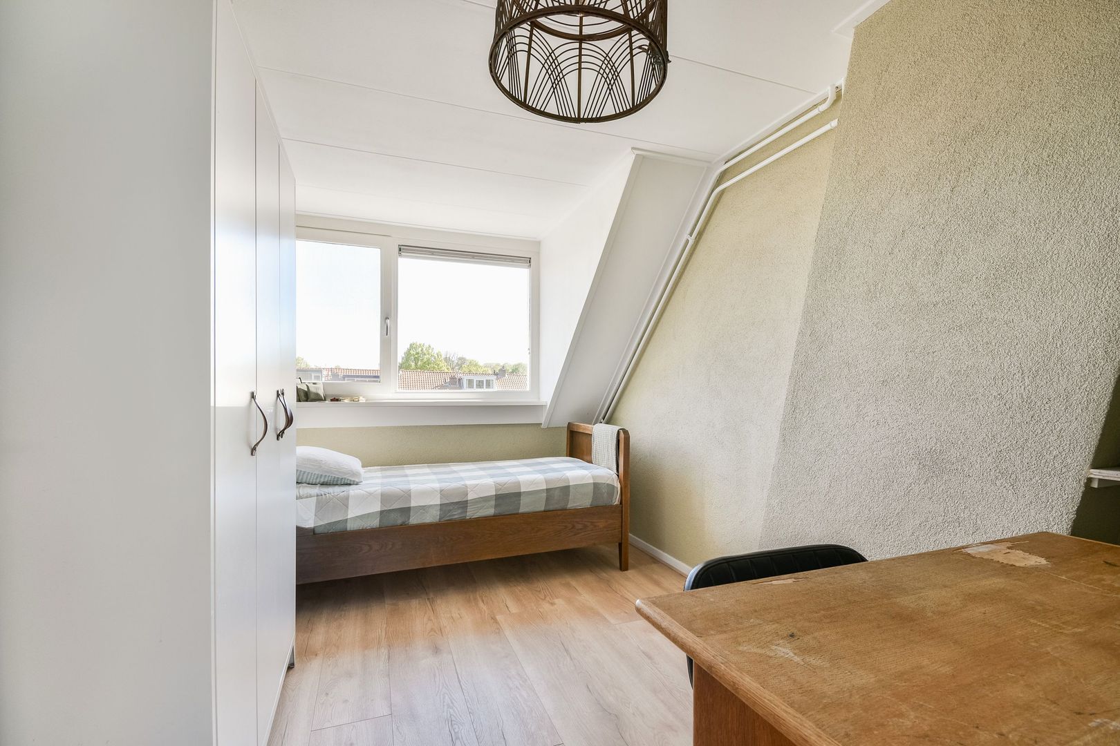 Slaapkamer aan voorzijde van ruim 10 m2 met laminaatvloer en kunststof dakkapel met elektrische screens.