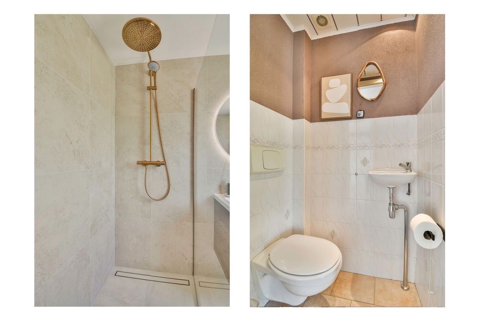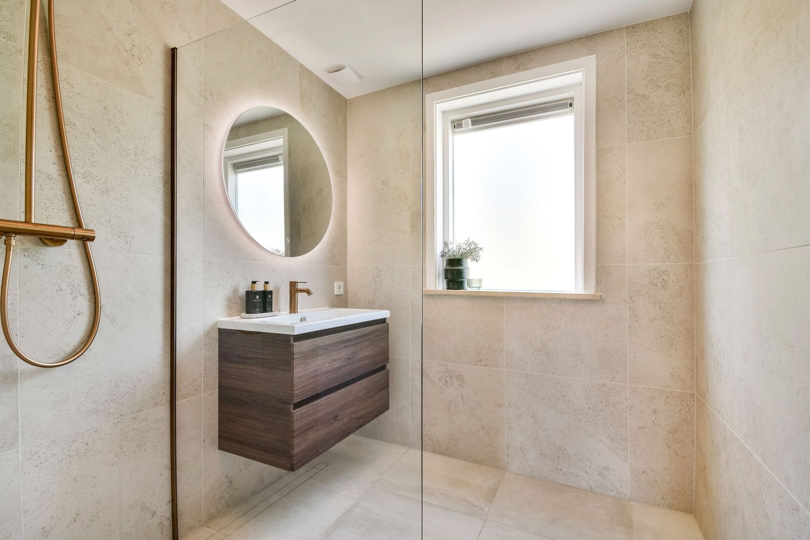 Nieuwe in 2024 geplaatste mooie badkamer met inloopdouche met watergoot, wastafelmeubel, elektrische handdoekenradiator, mechanische afzuiging, gestukt plafond met ingebouwde verlichting, raam met daglicht.