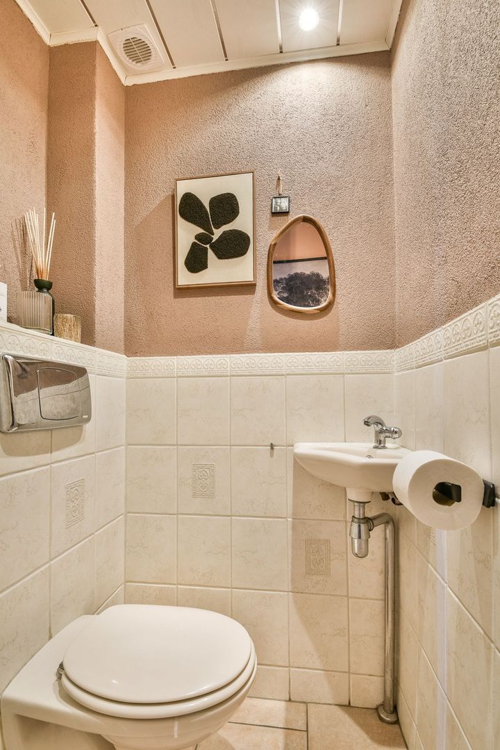 Overloop, apart zwevend toilet met fonteintje, gehele verdieping paneeldeuren.